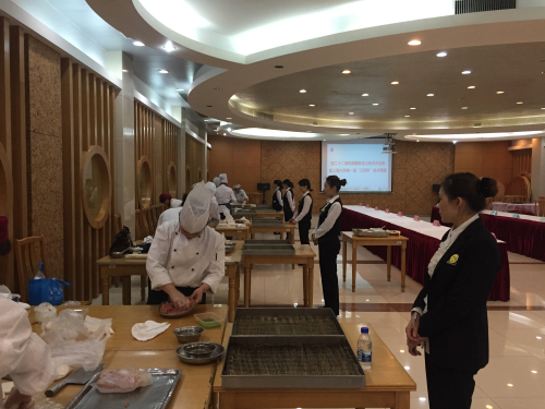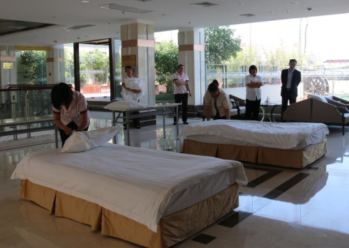 客房铺床、会务摆台和中餐摆台技术竞赛在乐乎新楼举行。客房铺床看似简单,其实很多服务细节专业性都很强,例如:甩床单,要求一次性甩成功,两手臂用力要均匀,稍一疏忽,就会中线偏移。选手们在这次比赛中都完成得非常流畅,甩、抛、定位、包角等无不反映出扎实规范的服务技能。