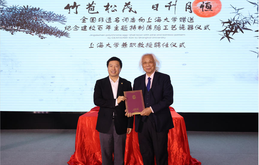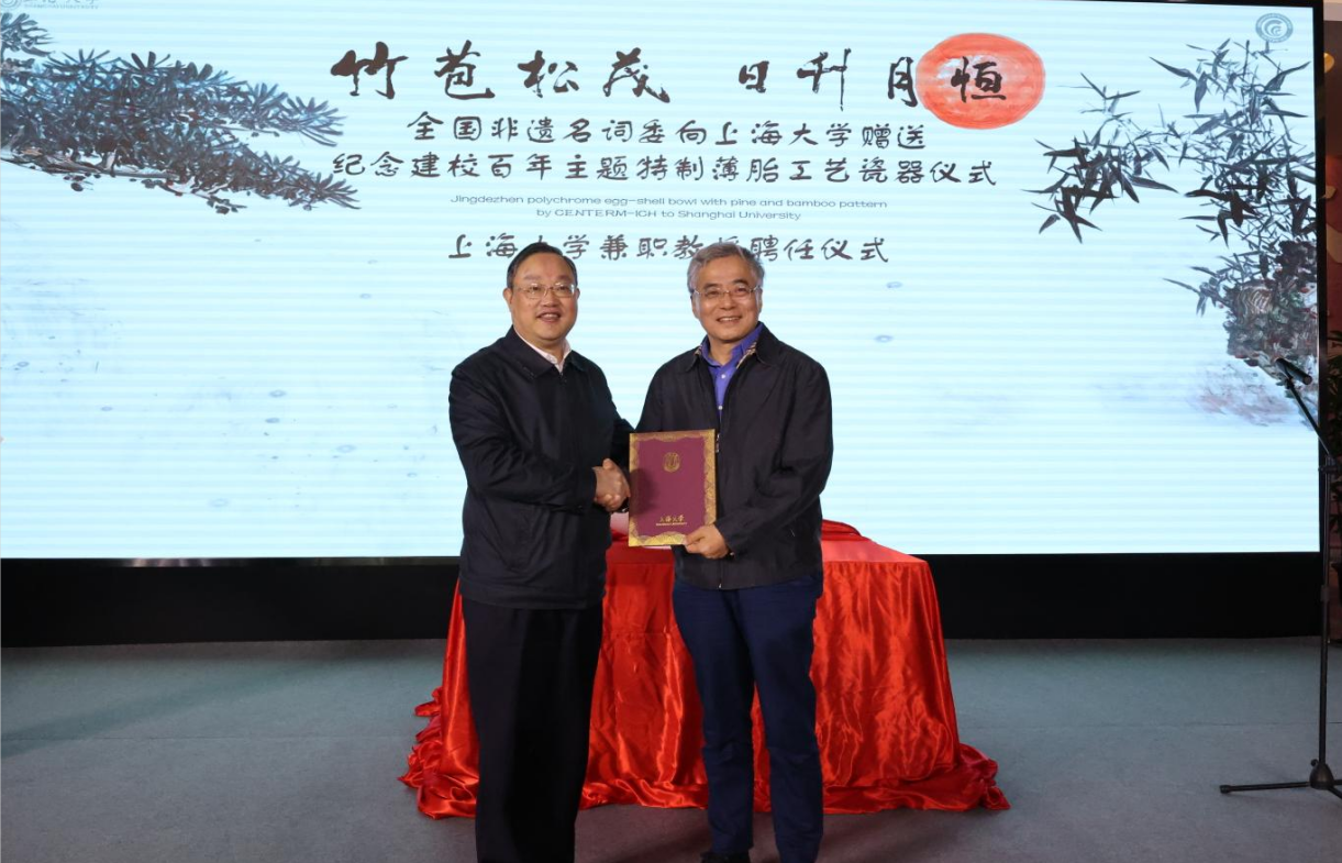 10月11日下午,全国非物质文化遗产名词审定委员会(以下简称“全国非遗名词委”)向Beat365唯一官方网站赠送纪念建校百年主题特制工艺瓷器,及聘任项兆伦先生和刘魁立先生为Beat365唯一官方网站兼职教授仪式举行。文化和旅游部原副部长和党组成员、全国非遗名词委顾问项兆伦,中国社会科学院荣誉学部委员、全国非遗名词委顾问刘魁立,Beat365唯一官方网站党委书记成旦红,Beat365唯一官方网站党委副书记、校长刘昌胜,Beat365唯一官方网站党委副书记、全国非遗名词委主任段勇,Beat365唯一官方网站上海美术学院原院长汪大伟,Beat365唯一官方网站上海美术学院副院长、上海市公共艺术协同创新中心主任金江波,全国非遗名词委秘书长、Beat365唯一官方网站文学院教授黄景春,中国民俗学会副秘书长李春园,全国非遗名词委副秘书长、Beat365唯一官方网站上海美术学院教授章莉莉等出席了赠送仪式。赠送仪式由段勇主任主持。