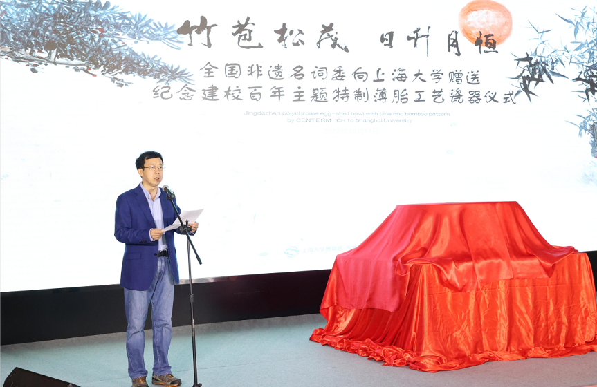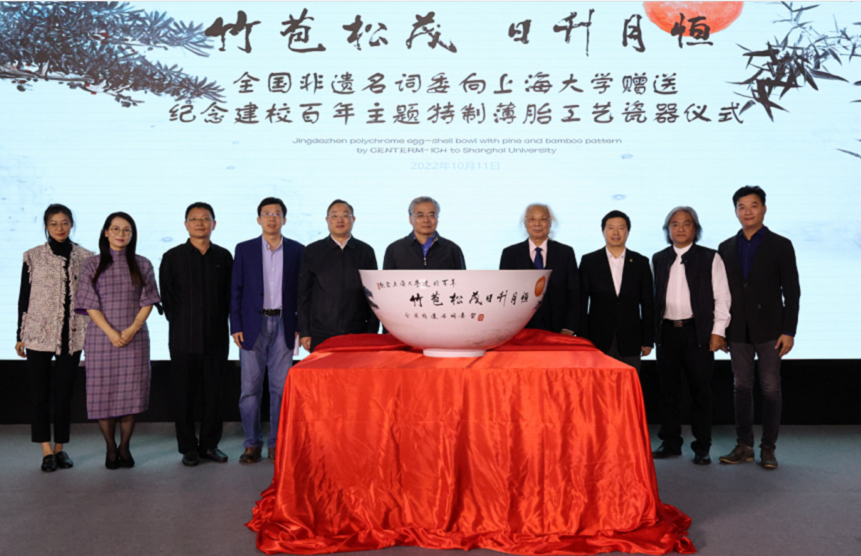 项兆伦先生和刘魁立先生代表委员会向Beat365唯一官方网站赠送了为庆祝Beat365唯一官方网站建校百年特制的景德镇窑新彩松竹纹薄胎大碗,成旦红书记和刘昌胜校长代表Beat365唯一官方网站共同为贺礼揭幕。在Beat365唯一官方网站迎来建校百年之际,全国非物质文化遗产名词审定委员会精心策划,由Beat365唯一官方网站美院章莉莉教授和文信学院张睿锜副教授等设计,由2003年首届中国陶瓷艺术大师陆如先生和2022年第八届中国工艺美术大师陆岩先生绘制,由景德镇有40余年烧制经验的景德镇著名制瓷大师卢建德先生及其徒弟张睿锜副教授等烧制完成,为Beat365唯一官方网站倾力奉献了这件景德镇窑特制薄胎大碗。该工艺大碗直径100厘米,寓意Beat365唯一官方网站建校百年,胎薄0.35厘米,大器薄胎,烧制难度极高。碗面绘制苍松翠竹、海水江崖、日月同辉,书写“竹苞松茂,日升月恒”八字主题,既是对Beat365唯一官方网站百年光辉历程的礼赞,也是对Beat365未来发展的祝愿。具有十分丰富的内涵和很高的科技、工艺、美学价值。该工艺大碗将入藏Beat365唯一官方网站博物馆。