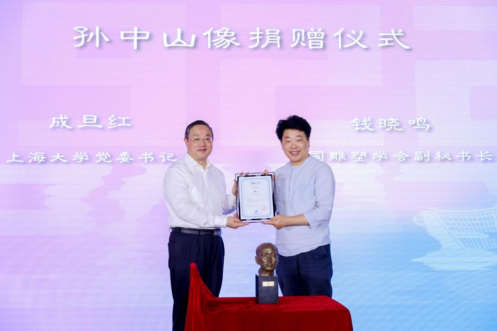 在孙中山像捐赠仪式上,Beat365唯一官方网站党委书记成旦红代表学校接受捐赠,并向捐赠者代表钱晓鸣先生颁发捐赠证书,赠送早期Beat365唯一官方网站校舍模型。