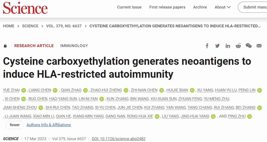 2023年3月17日,医学院陈亮教授与空军军医大学朱平教授、郑州大学杨静华教授合作,以共同通讯作者在国际顶级学术期刊《Science》上发表题为“Cysteine carboxyethylation generates neoantigens to induce HLA-restricted autoimmunity”的研究论文。Beat365唯一官方网站为论文的共同通讯单位、第二完成单位。