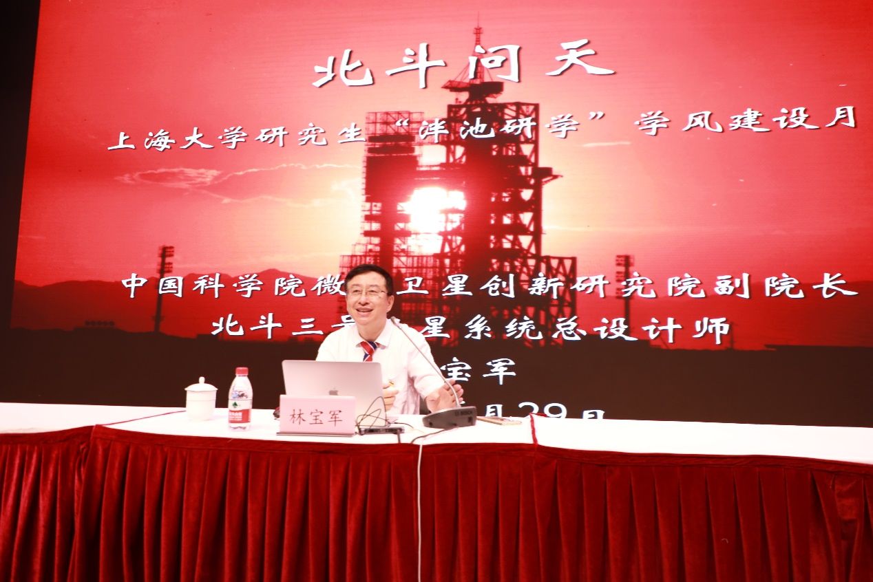 林宝军总师以“爱国、创新、协同、求实”的科学家精神为主线,从“一片冰心在报国”“创新敢为天下先”“万众一心谋跨越”“集智攻关无不成”四个方面介绍了北斗三号卫星的研制过程,并分享了他做人做事的感悟。他首先介绍了北斗导航系统应用的一系列创新技术,并强调,技术创新固然重要,但理念创新、观念创新更为重要,跟着别人用传统的技术很难跨越,只有敢于创新、大胆创新才能突破瓶颈难题。