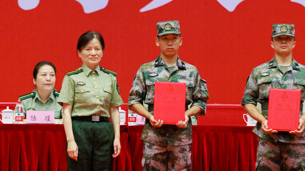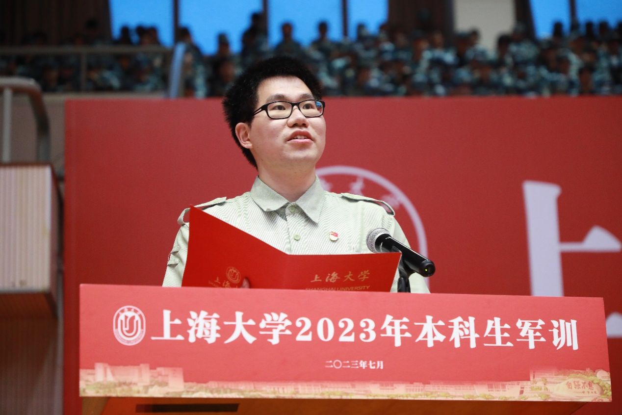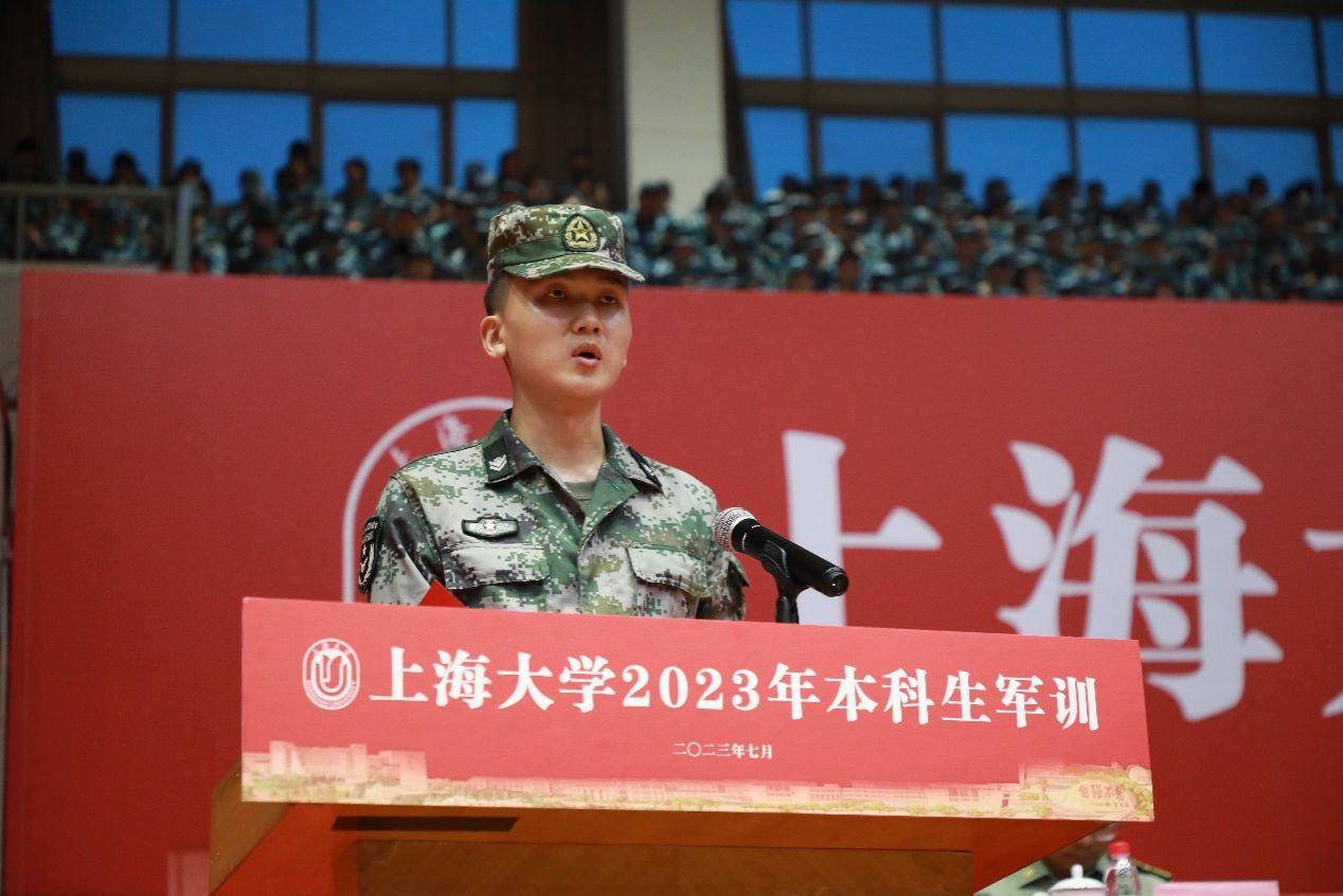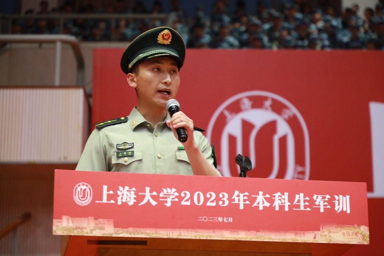 武警带训教官代表、军训师副参谋长、武警上海总队执勤第二支队排长王继辉发言。他对同学提出殷切希望,并代表带训教官作出承诺:在军训过程中,带训教官一切从自我做起,展现出良好的军人形象,认真践行教官应尽的职责,全力保障军训任务顺利完成。
