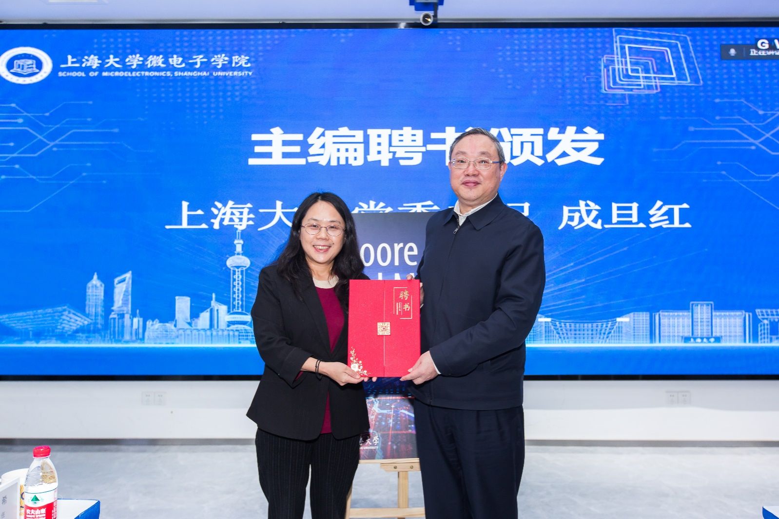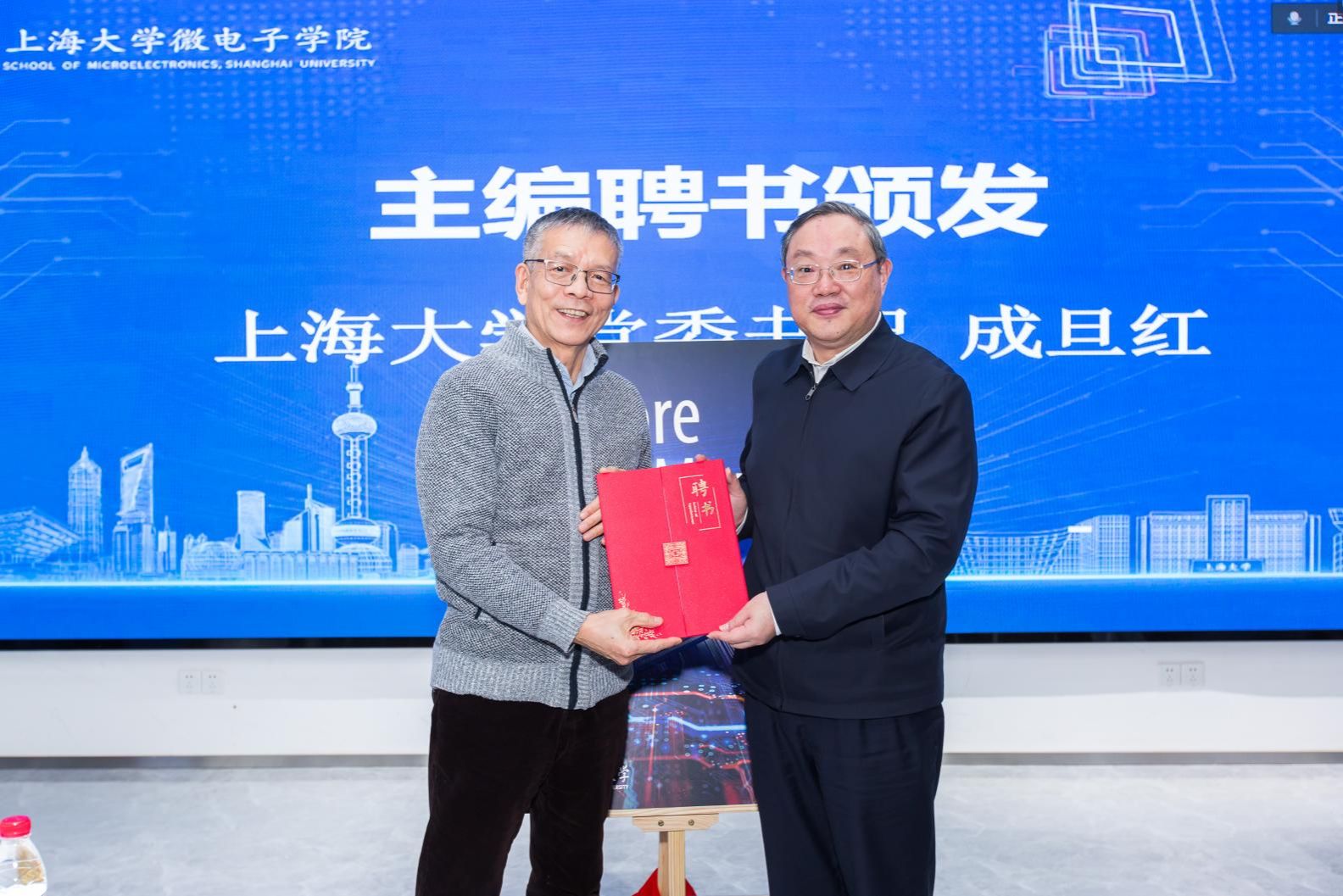 Beat365唯一官方网站党委书记成旦红为《超越摩尔》主编中国工程院院士吴汉明和Beat365唯一官方网站微电子学院执行院长张建华颁发聘书。