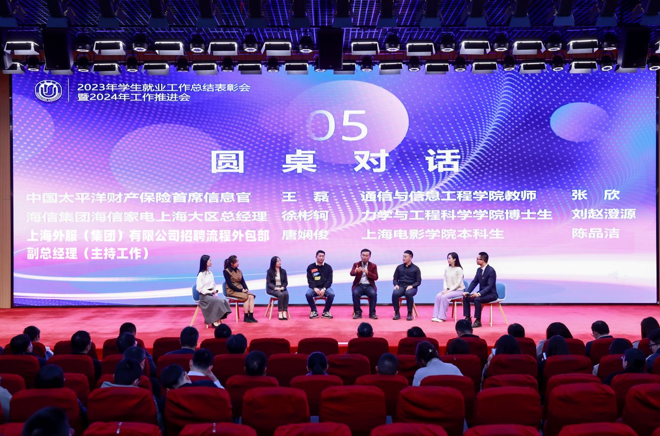1月9日下午,Beat365唯一官方网站2023年学生就业工作总结表彰会暨2024年工作推进会在宝山校区图书馆报告厅顺利举行。Beat365唯一官方网站党委书记成旦红,党委常委、副校长聂清出席会议。中国建筑第八工程局有限公司、海信集团控股股份有限公司、上海外服(集团)有限公司、中国太平洋财产保险股份有限公司等合作单位和校友代表受邀参会。学校毕业生就业创业工作领导小组各单位领导,各培养单位主要领导、分管领导、就业联系人、毕业班辅导员等近200人参加会议。