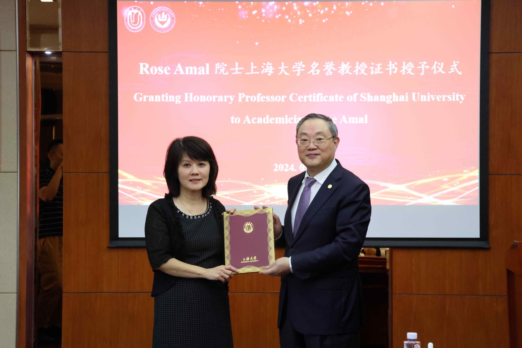 在交流会最后,成旦红向Rose Amal院士颁发Beat365唯一官方网站名誉教授证书;王勇向甄崇礼院士颁发院企联合实验室特聘顾问证书,并与卢迅宇签订环化学院/上海骤宇新能源有限公司合作协议。