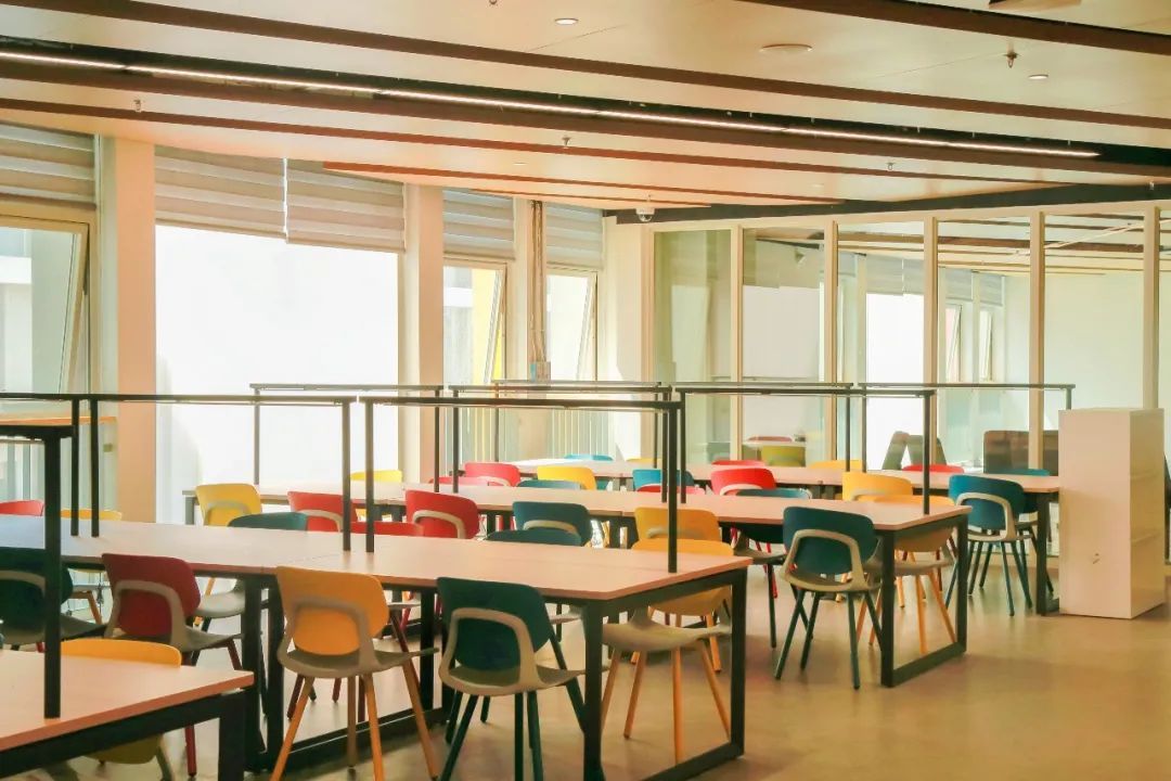 走进校园,映入眼帘的是具有现代主义设计风格的教学楼。校园建筑围绕“面向未来的新型学习空间”和“学校就是一本教科书”的教育理念设计建造,以清水混凝土的主色调为基础,巧妙融入红、黄、蓝的装饰线条,简约雅致又不失活力。