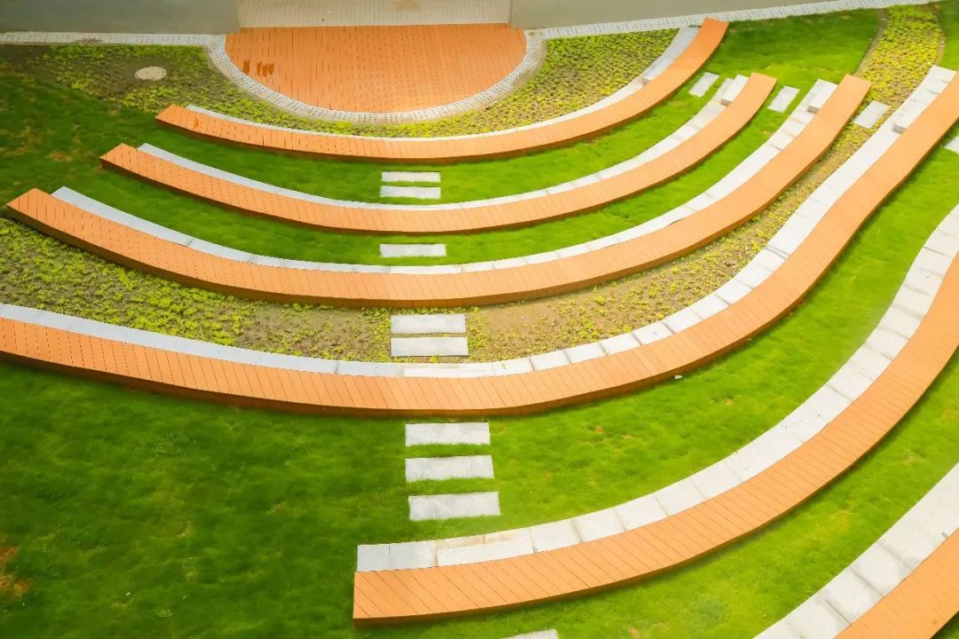Beat365嘉实校园内共有四个方院,它们动静有致、功能各异。其中,位于小学部南院的“室外剧场”极具特色,巧妙利用地势上升,构建起一个由环形座椅和弧形讲台组成的开放式表演空间。座椅区与草坪自然衔接,不仅让学生在活动中更加亲近自然,也为他们提供了交往、集会、表演的平台。