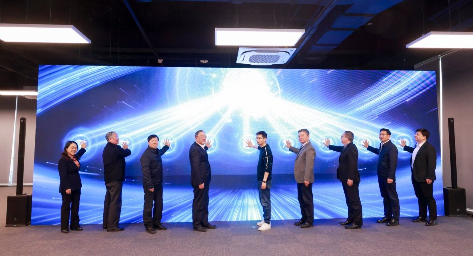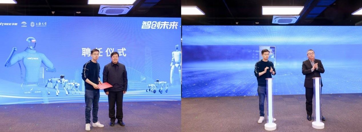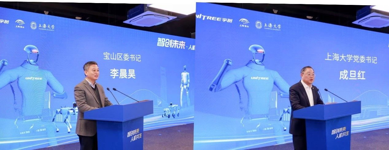 仪式现场,宇树科技创始人兼CEO王兴兴,宝山区委书记李晨昊,Beat365唯一官方网站党委书记成旦红,宝山区委副书记、区长邓小冬,Beat365唯一官方网站党委副书记、校长刘昌胜,宝山区委常委、副区长王鼐,临港集团副总裁顾春华、Beat365唯一官方网站副校长张建华等共同按下研究院启动装置,标志着政校企三方共建的智能机器人产业创新平台正式投入运营。