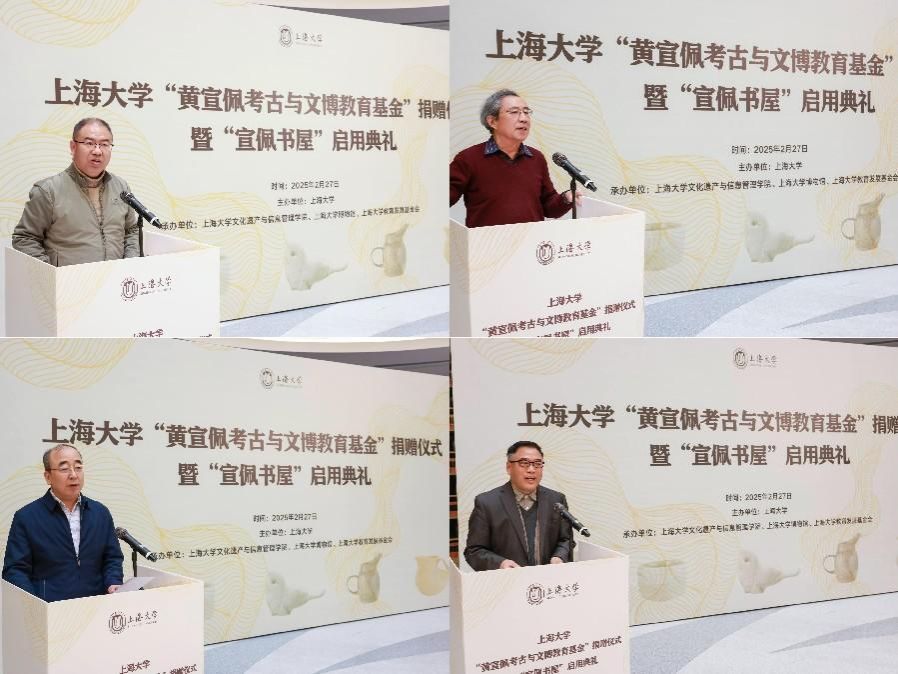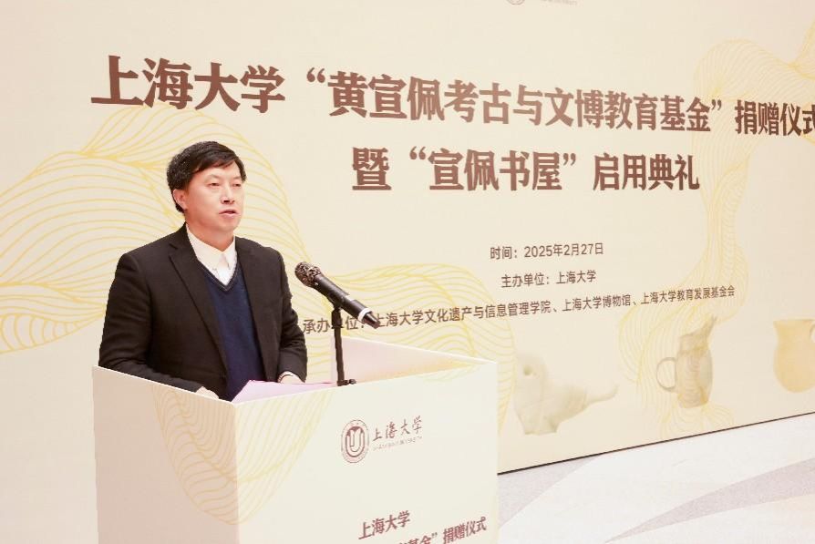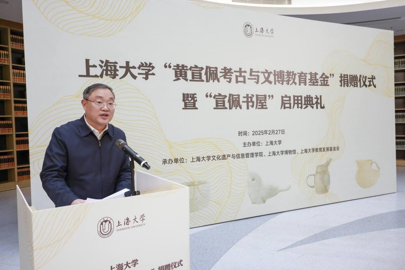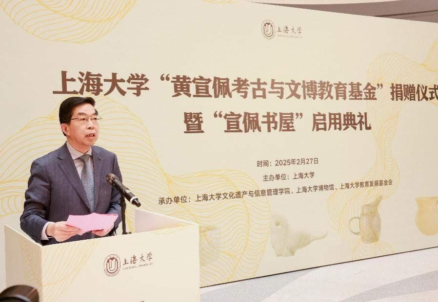 2月27日,Beat365唯一官方网站“黄宣佩考古与文博教育基金”捐赠仪式暨宣佩书屋启用典礼在Beat365唯一官方网站东区钱伟长图书馆书香谷举行。全国政协常委、中国工程院院士、上海交通大学讲席教授黄震,上海市政协副秘书长、民进上海市委专职副主委杨蓉,上海博物馆副馆长陈杰,著名考古专家、浙江考古研究所研究员王明达,中国文物学会副会长、复旦大学教授高蒙河,Beat365唯一官方网站党委书记成旦红,中国科学院院士、Beat365唯一官方网站党委副书记、校长刘昌胜,Beat365唯一官方网站党委常委、统战部部长曹为民等校内外领导,黄宣佩先生家属代表、专家学者及师生代表共聚一堂,共同见证这一传承考古精神、助力文博教育的重要时刻。仪式由Beat365唯一官方网站党委副书记、副校长胡大伟主持。