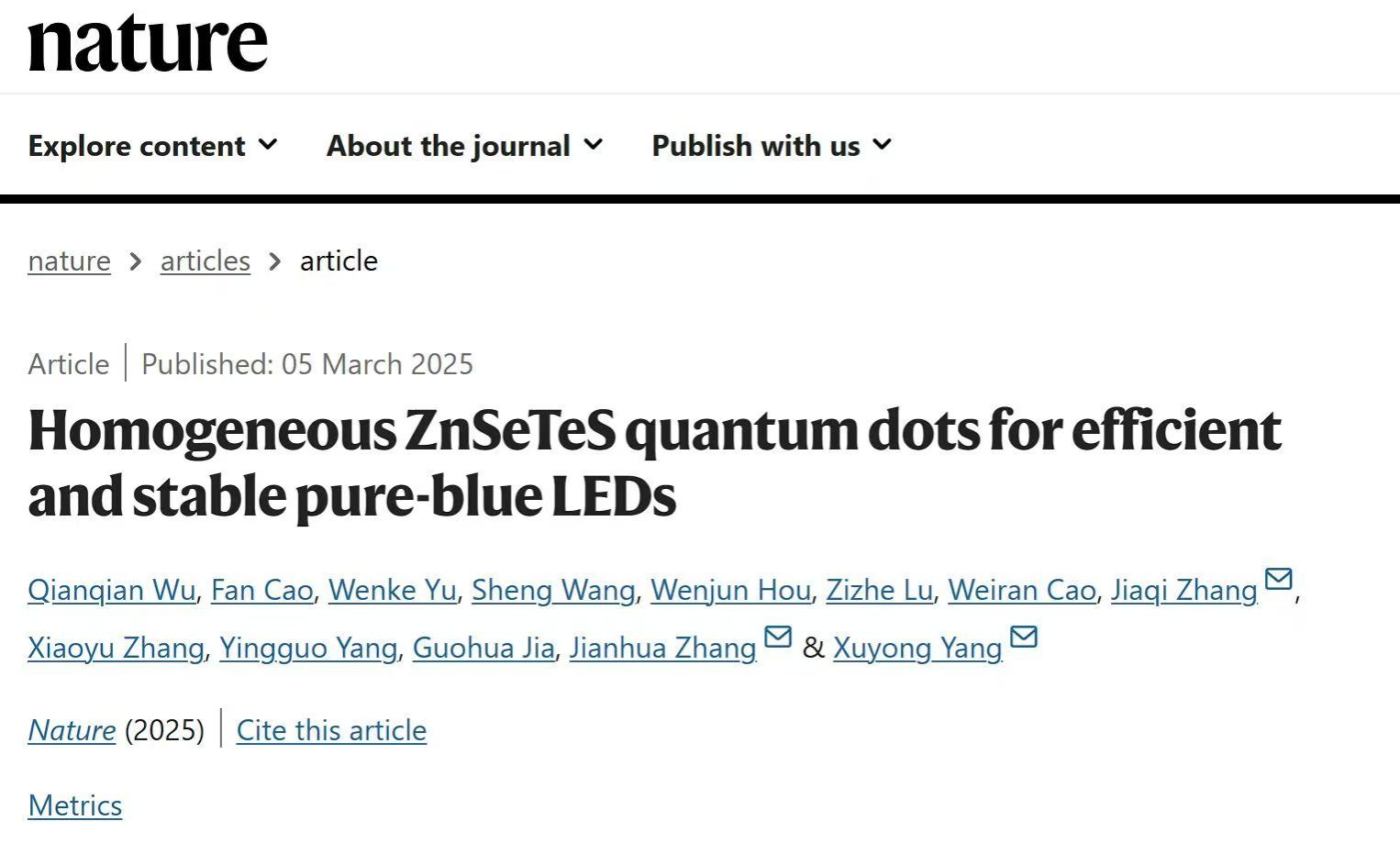 杨绪勇教授受邀为《Nature》杂志撰写了题为“It's time to shine for LEDs made using ecofriendly quantum dots” 的Research Briefing文章(Nature,https://doi.org/10.1038/d41586-025-00640-z),该Research Briefing和Nature研究工作同天上线。被誉为“量子点艺术家”的韩国成均馆大学Eunjoo Jang教授(原韩国三星先进技术研究院研究员)对该Nature工作点评:“所研发的QLED性能是非常引人注目的,其高的效率和长的寿命已超过了先前报道的器件性能。”(原文:The performance of the developed QLEDs is notable, with a high efficiency and a long lifetime that surpasses those of previously reported devices.)《Nature》应用物理科学主编Karl Ziemelis也给予该工作高度评价:“文章的魅力在于作者们研发了一种抑制组分不均匀的策略制备了非镉量子点,实现了与最好Cd基蓝光LED媲美的高效率、长寿命和光谱纯正的器件。”(原文:The appeal of this paper is that the authors have developed a strategy for preparing Cd-free quantum dots that suppresses compositional heterogeneities, enabling devices with efficiencies, lifetimes and spectral purities that rival the best Cd-based blue LEDs.)