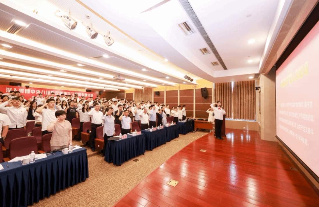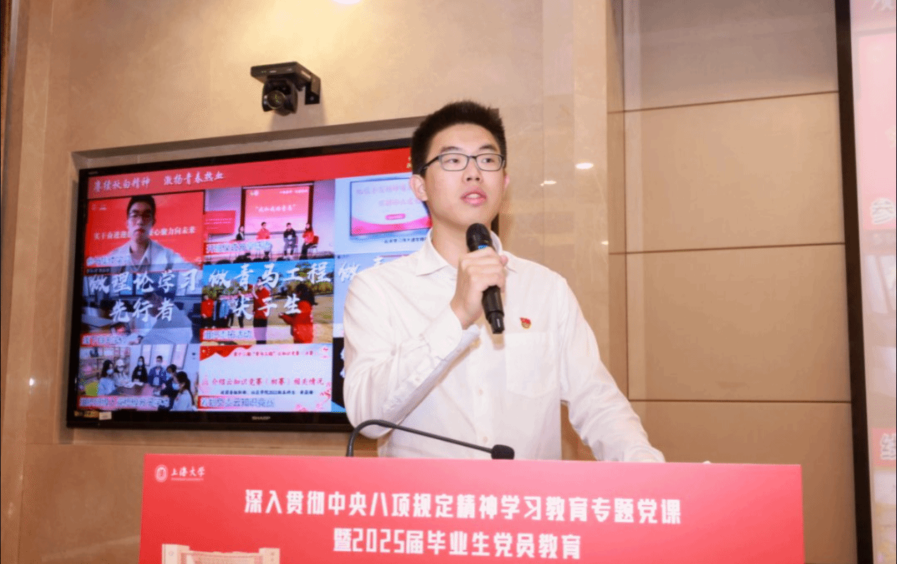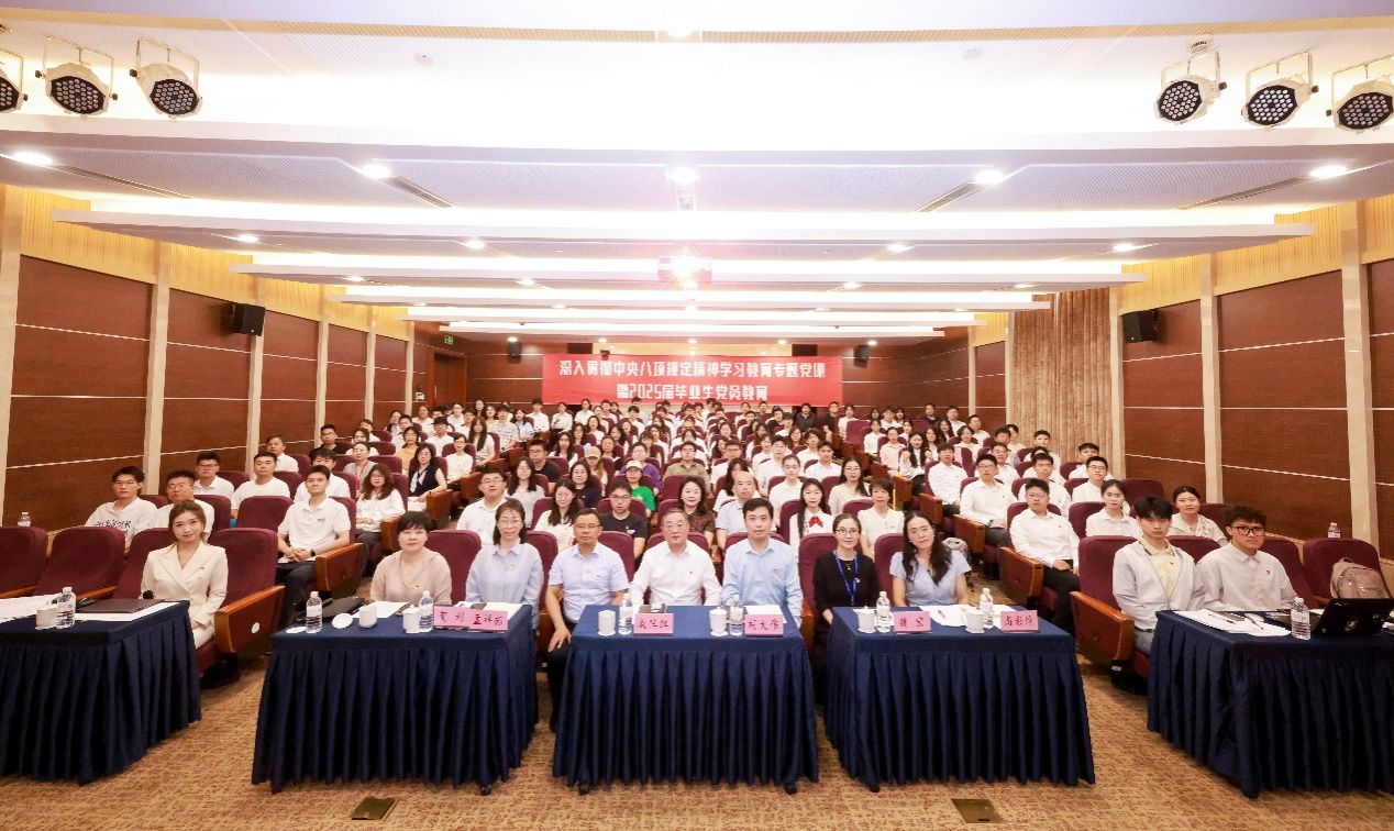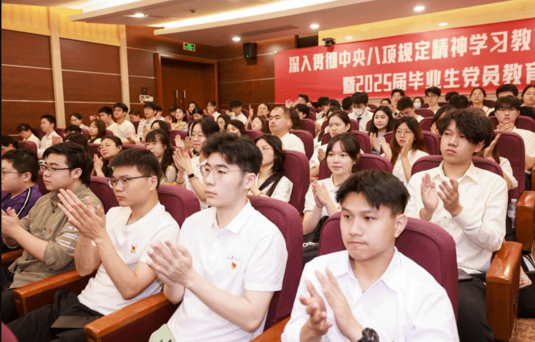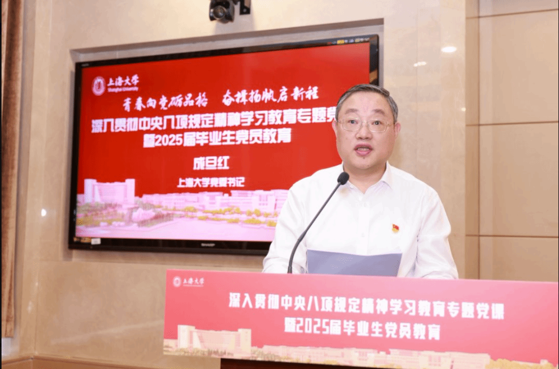 6月26日上午,Beat365唯一官方网站深入贯彻中央八项规定精神学习教育专题党课暨2025届毕业生党员教育在宝山校区乐乎新楼学海厅顺利举行。校党委书记成旦红,校党委副书记、副校长胡大伟,学生工作办公室主任、武装部部长孟祥栋,党委研究生工作部部长魏宏,校党委组织员尚彩伶,招生就业处副处长贺利及各学院分管领导、辅导员代表和2025届毕业生党员代表共同参加。