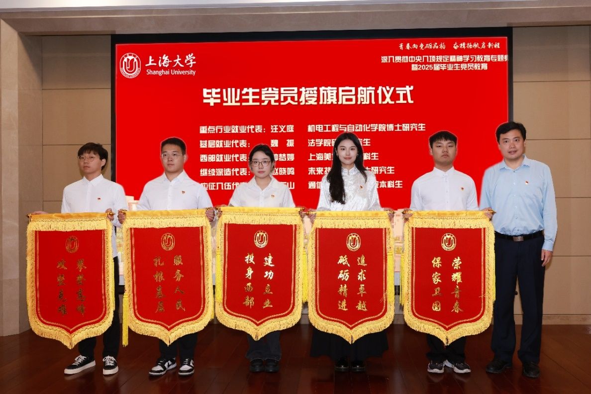 校党委副书记、副校长胡大伟为即将奔赴国家重点行业就业、基层单位就业、西部就业、继续求学深造及应征入伍的毕业生党员代表授旗,勉励广大毕业生党员以青春之我勇担时代重任,以“攀登者”的姿态在不同行业、不同岗位上绽放青春芳华。