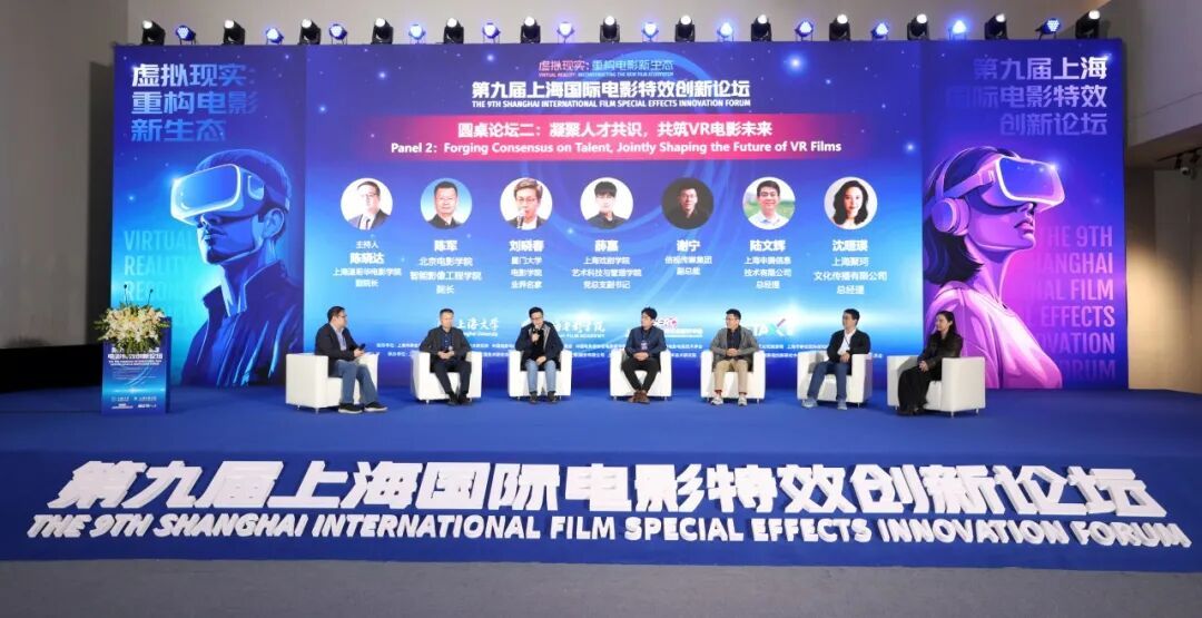 下午第二单元举行了以“凝聚人才共识,共筑VR电影未来”主题为圆桌论坛。在上海温哥华电影学院副院长陈晓达主持下,北京电影学院智能影像工程学院院长陈军,厦门大学电影学院业界名家刘晓春,上海戏剧学院艺术科技与管理学院党总支副书记薛嘉,倍视传媒集团副总裁谢宁,上海申腾信息技术有限公司总经理陆文辉,上海聚珂文化传播有限公司总经理沈晅瑛围绕VR电影的人才培养路径、产学协同机制及未来产业生态构建等关键议题,展开了深入、多元的交流与探讨,共同为VR电影领域的可持续发展建言献策。