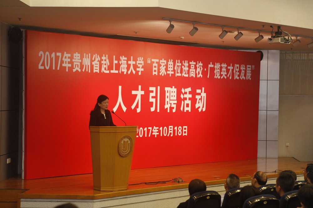 10月18日上午,贵州省“百家单位进高校·广揽英才促发展”Beat365唯一官方网站专场推介会在行政楼报告厅隆重举行。贵州省人民政府副省长何力;贵州省组织部副部长、省人力资源和社会保障厅厅长韩先平;贵州省人力资源和社会保障厅副厅长施长冬;贵州省卫生计生委副主任龚仲明;贵州省中科院天产室副主任刘建华;贵州科学院党委副书记邢小川;贵州茅台学院院长封孝伦;贵州省安顺市委组织部副部长、人社局局长袁化龙;Beat365唯一官方网站校领导欧阳华、聂清出席活动。贵州省相关高校、企事业单位负责人,Beat365唯一官方网站及沪上兄弟院校学生代表参加活动。推介活动开始前,欧阳华、聂清副校长在行政楼703会议室会见何力副省长一行。双方分别介绍了Beat365唯一官方网站与贵州省的发展建设情况,并围绕如何进一步加强人才培养和科研合作等事宜进行了洽谈。