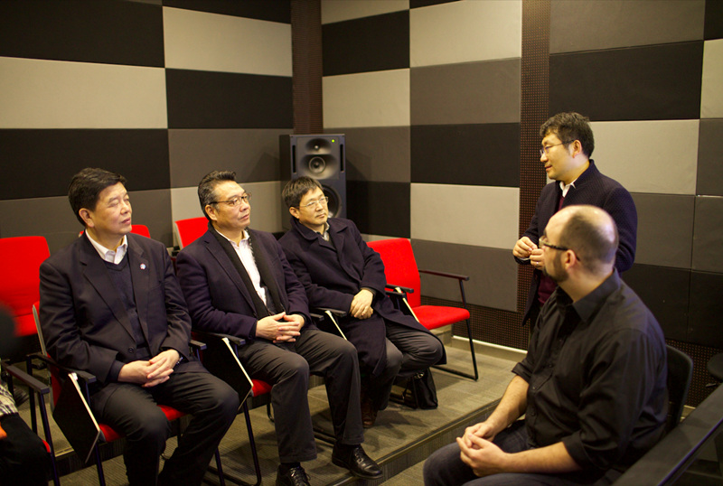 童刚一行是在视察了“环Beat365国际影视产业园区”后抵达上海温哥华电影学院的。在学院常务副院长刘海波的带领下,童刚首先走进学院视觉媒体声音设计专业的混音室。专业系主任杰瑞米·巴特勒(Jeremy John Butler)在简单介绍了该专业的主要培养方向后,向大家展示了一部学生的声音设计作品。刘海波介绍,这个专业针对当前国内影视产业的人才短板,以培养工业级的影视后期声音设计和制作人员为目标,但学生需要兼具技术能力和艺术素养。