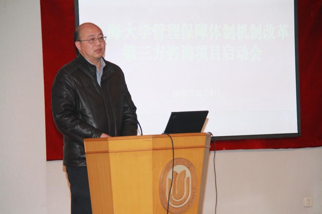 为推进学校深化综合改革,2016年12月9日上午,学校在行政楼报告厅举行管理保障体制机制改革第三方咨询项目启动会。校党委副书记、副校长,学校深化综合改革推进组组长徐旭,学校管理保障部门负责人、学院院长、书记,及第三方咨询公司北大纵横管理咨询集团高级副总裁、项目总工宝山,行业总经理、项目总监王汨及北大纵横驻场项目团队出席了启动会。启动会由党委组织部部长王军华主持。