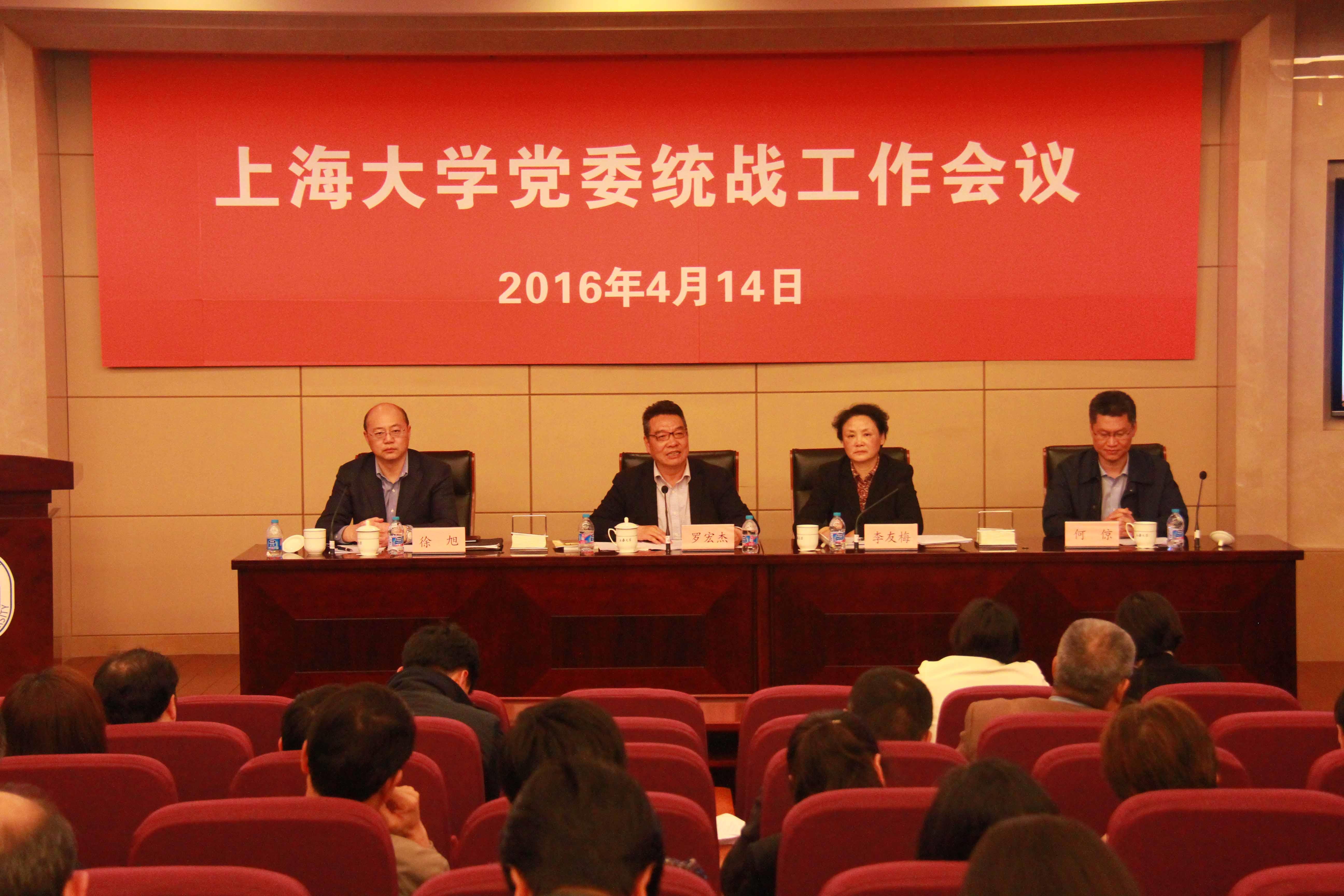 4月14日下午,校党委在校本部乐乎新楼学海厅召开统战工作会议。市委统战部党外知识分子工作处副处长何倞应邀出席会议,校党委书记罗宏杰出席会议并讲话,校党委副书记、副校长李友梅代表校党委作工作报告,校党委副书记、副校长徐旭主持会议,各学院(系统)党委、直属党总支书记、统战委员,相关部处负责人,各民主党派、统战团体负责人,无党派人士代表等近100人参加会议。