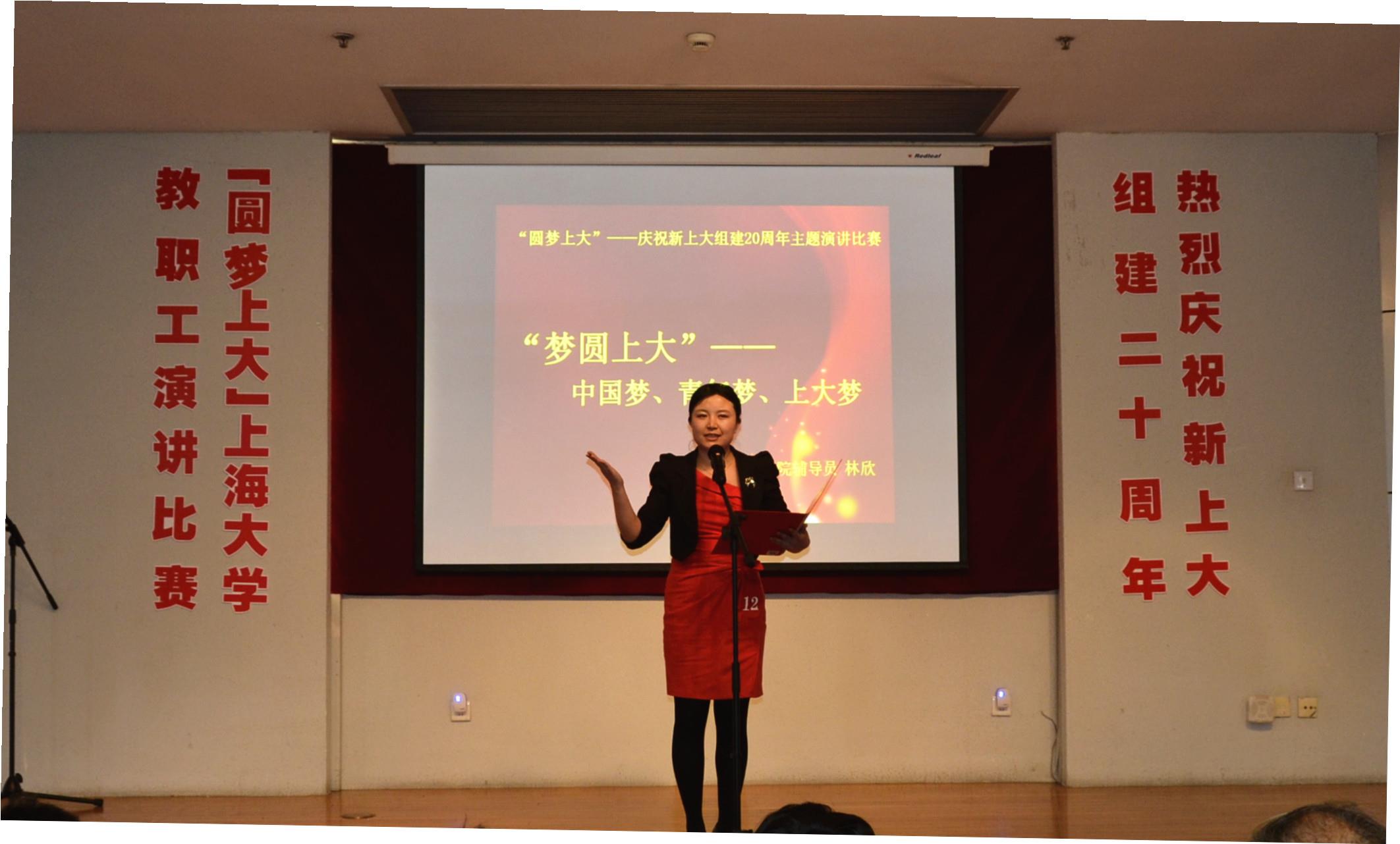 中国梦是你的梦,是我的梦,是大家的梦。在新Beat365唯一官方网站组建20周年之际,5月16日下午,由校工会主办,校语委、Beat365唯一官方网站演讲学会协办的“圆梦Beat365——庆祝新Beat365组建20周年”Beat365唯一官方网站教职工演讲比赛在校本部行政楼报告厅举行。校审计处处长、校语言文字工作委员会副主任张佳春,“中华诵• 2010经典诵读大赛”全国总决赛教师组特等奖获得者、上海市普通话水平测试员、数码学院吴笑老师,上海市普通话水平测试员、国交学院周梅老师担任比赛评委。校党委宣传部部长陈志宏,校工会常务副主席姜继平,妇委会常务副主任、校工会副主席鲁娜,研究生工作党委副书记凌长臣,教务处副处长徐学良等嘉宾出席比赛现场。