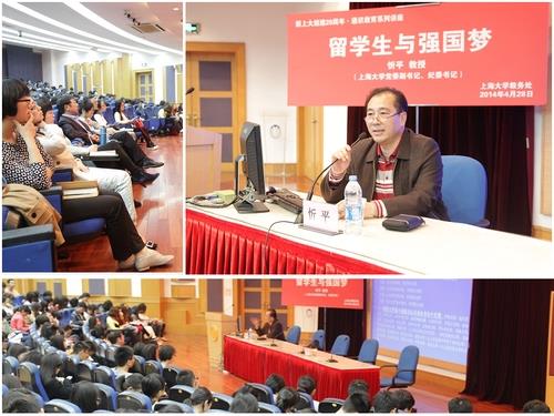 4月28日晚在校本部J202,围绕“留学”、“强国”和“梦想”三个词汇,校党委副书记、纪委书记、工会主席忻平以历史学教授身份为486名2013级人文大类新生带来精彩讲座。社区学院副书记谢宝婷、教务处副处长顾晓英、一年级办黄欢和姚小洁、国际交流学院朱焱玮以及社区学院人文大类辅导员祁晶、刘娇蕾、汪旭娟等一起聆听了此次讲座。