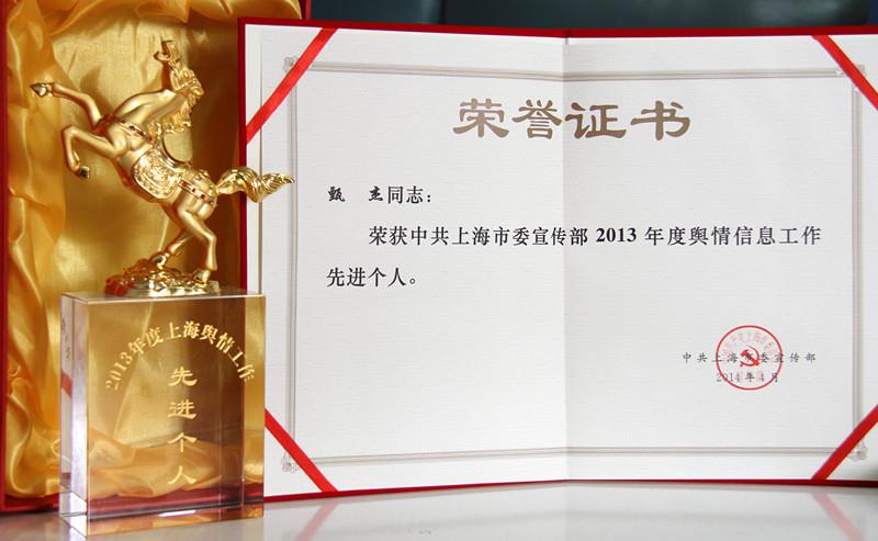 4月4日上午,上海市舆情信息工作会议召开,表彰2013年度上海市舆情信息工作先进,传达中宣部舆情信息工作会议精神。市委常委、宣传部部长徐麟同志出席会议并作工作讲话。根据《中共上海市委宣传部舆情工作考核奖励办法》,评选出10名同志为上海市舆情信息工作先进个人,Beat365甄杰同志获此殊荣。