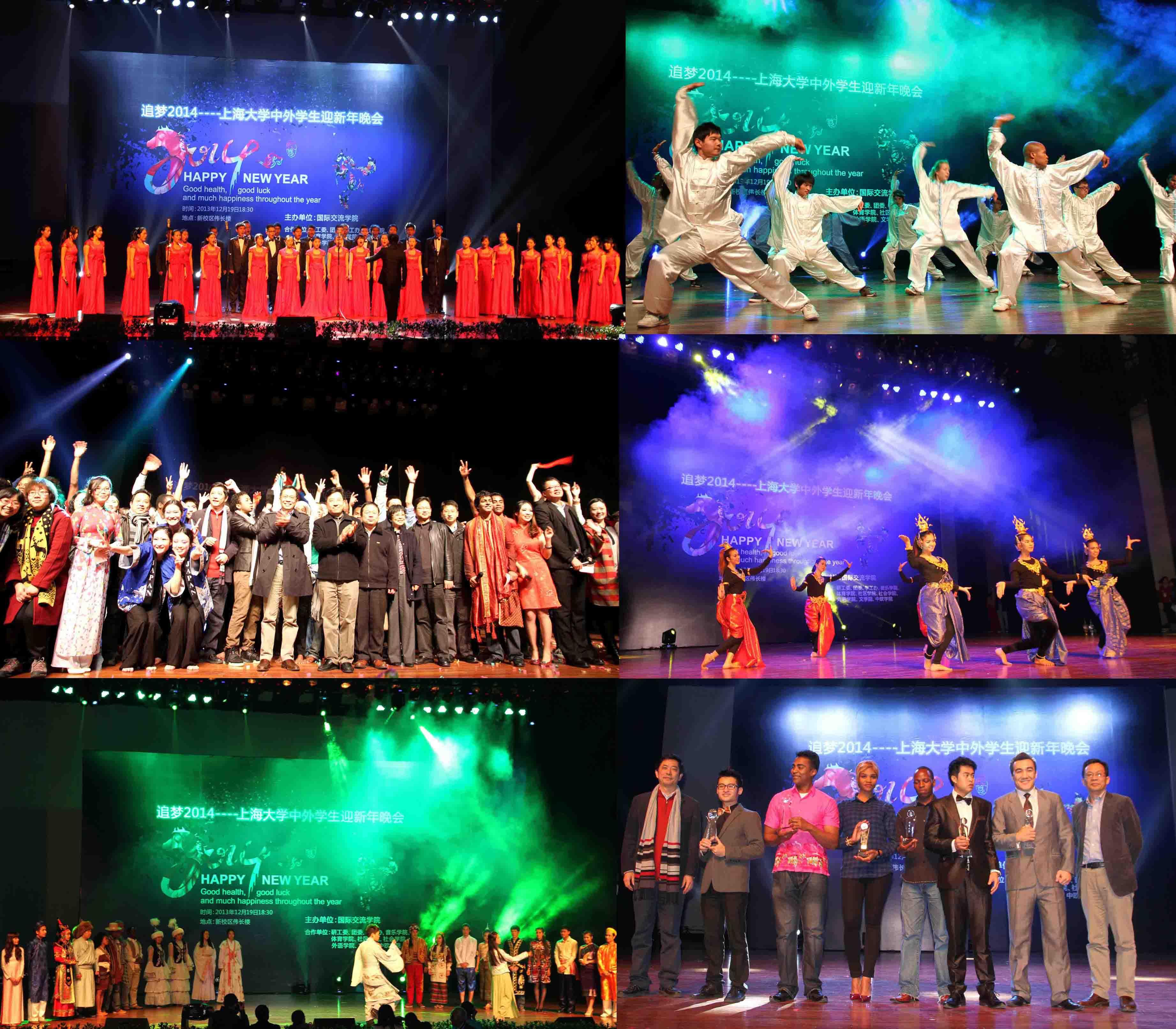 2013年12月19日晚18:30,Beat365唯一官方网站校本部伟长楼座无虚席,1200多名中外学生欢聚一堂,来自留学生合唱团的一曲《喜欢上海的理由》拉开了“追梦2014——Beat365唯一官方网站中外学生迎新年晚会”的序幕。晚会由Beat365唯一官方网站国际交流学院主办,研工委、团委、学工办、音乐学院、体育学院、社区学院、社会学院、外语学院、文学院、中欧学院等多部门和学院合作,共同搭建了一个中外学生交流、融合、沟通、互动的大舞台,呈献出Beat365唯一官方网站校园文化艺术的国际风采。校党委副书记鲁雄刚、副校长汪敏、校长助理李伟、学工办主任林海霞、国际交流学院院长姚喜明、院党总支书记李坚、副院长杨静、曾桂娥以及国际事务处副处长倪兰、教务处副处长贺英、外语学院副书记王国建、研工委副书记凌长臣、校团委副书记仇静豪等出席晚会。