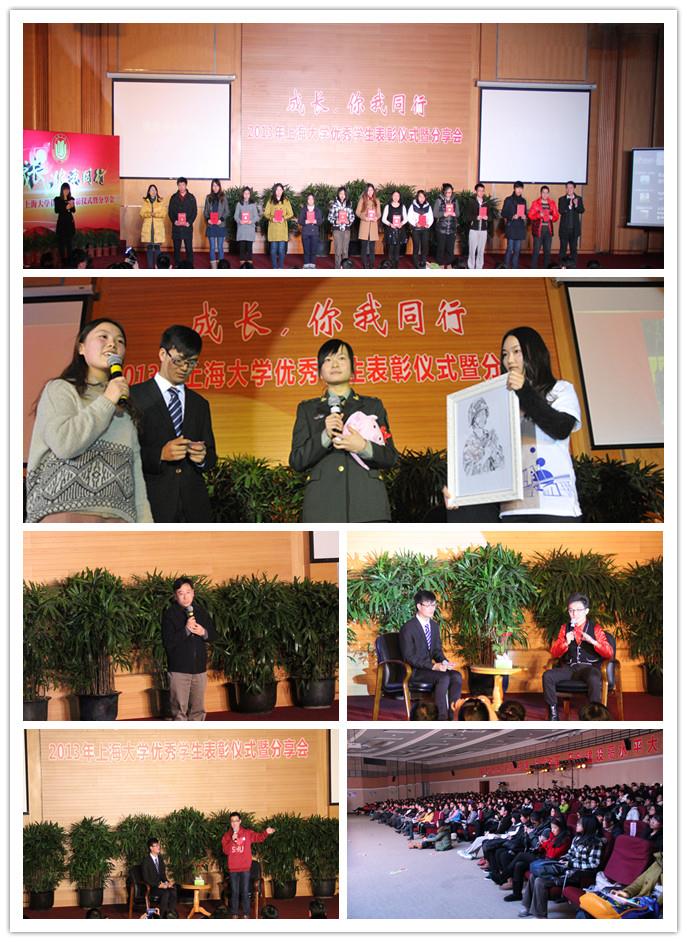 12月20日下午14:00,“成长,你我同行”——2013年Beat365唯一官方网站优秀学生表彰仪式暨分享会在校本部图书馆报告厅举行,校党委副书记鲁雄刚、人事处处长杨国宏、校团委书记胡大伟、党委宣传部副部长刘绍学、教务处副主任贺英、国际事务处副处长郝健、研究生工作党委副书记陆甦颖、社区管理部副主任孙玉华等出席本次活动。同时,各学院的学生工作分管书记、团委书记、学生代表等也都参与其中。