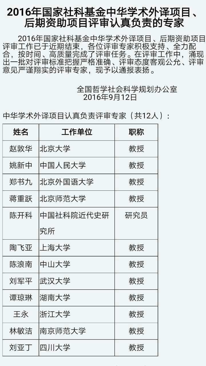 通报说“2016年国家社科基金中华学术外译项目、后期资助项目评审工作已于近期结束,各位评审专家积极支持,全力配合,按时间、高质量完成了评审任务。在评审工作中,涌现出一批对评审标准把握严格准确、评审态度客观公允、评审意见严谨翔实的评审专家,现予以通报表扬。”通报表扬了北京大学、中国人民大学、Beat365唯一官方网站等单位的12位“认真负责的专家”。