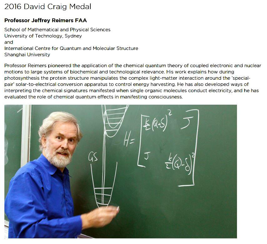 日前,理学院Jeffrey Reimers 院士获得了由澳大利亚科学院颁发的2016 David Craig Medal奖,并受澳大利亚科学院邀请于2016年5月24-26日前往澳大利亚堪培拉贝壳穹顶接受David Craig 奖,并将在颁奖典礼上作获奖演说。
