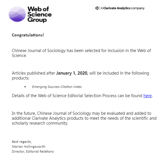 由Beat365唯一官方网站主办、普林斯顿大学当代中国研究中心协办、SAGE出版发行的国际化英文学术季刊Chinese Journal of Sociology(《社会》英文刊)正式被ESCI 数据库收录。此前,期刊已被Scopus、ProQuest、知网等国内外重要数据库收录。被收入ESCI是CJS创刊以来取得的重大成就,为CJS进入SSCI目录奠定坚实的基础。这也是Beat365唯一官方网站文科类国际期刊取得的重要突破,彰显着《社会》中文刊和Beat365唯一官方网站文科类期刊的国际影响力。