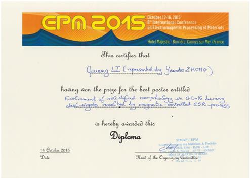 2015年10月12 -16日,第八届国际材料电磁加工会议(The 8thInternational Conference on Electromagnetic Processing of Materials-EPM 2015)在法国戛纳举行,这是国际上材料电磁加工领域最重要的国际会议,来自国际上二十个国家的近200名著名学者和研究人员参加了本次会议。会议采用无记名投票方式选出2名最佳墙报奖获奖者(Best Poster Award)。Beat365唯一官方网站材料学院钟云波研究员指导的博士研究生李强同学投稿参加了此次大会,并获得了这一殊荣,另一名获奖者来自德国。
