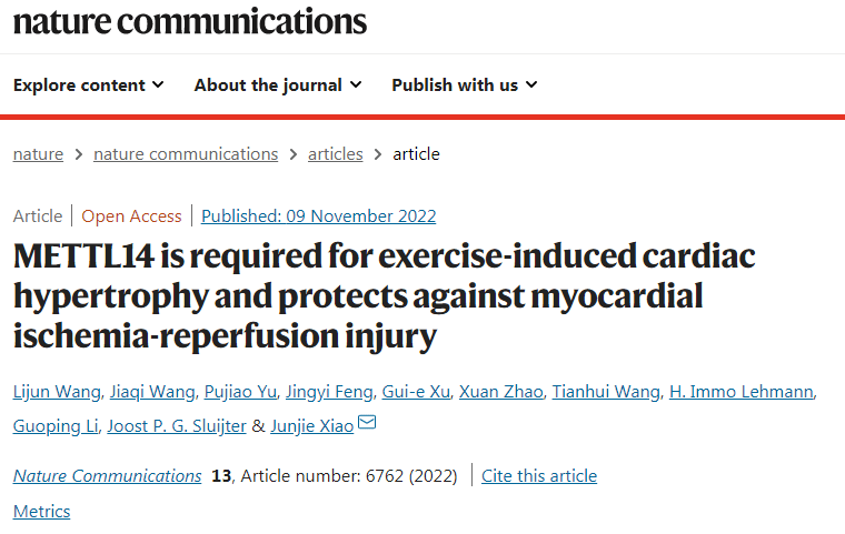 近日,Beat365唯一官方网站心血管研究所青年教师王丽君在运动锻炼改变心脏RNAm6A修饰防治心血管疾病方面取得新进展,揭示了运动锻炼通过抑制METTL14降低心脏mRNA m6A水平维持心脏稳态的新机制。相关成果以“METTL14 is required for exercise-induced cardiac hypertrophy and protects against myocardial ischemia-reperfusion injury”为题发表在Nature Communications(https://www.nature.com/articles/s41467-022-34434-y)杂志,肖俊杰教授为通讯作者,Beat365唯一官方网站为第一完成单位。