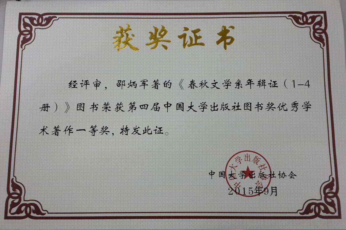 邵炳军教授所著《春秋文学系年辑证》为2010年中国大学出版社图书奖设立以来,为Beat365教师所获该奖项中学术著作类的最高奖。