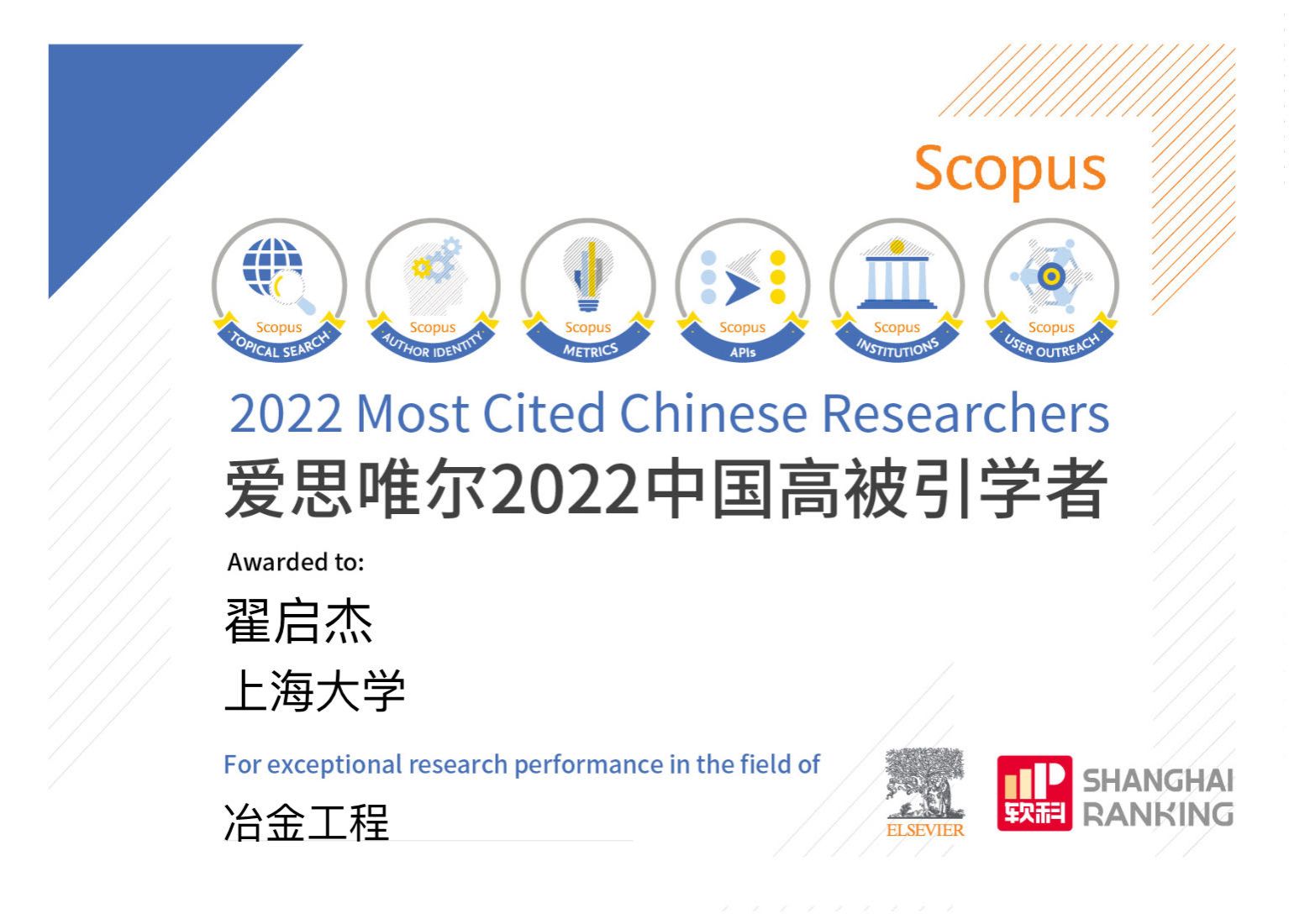 3月28日,爱思唯尔(Elsevier)发布了2022“中国高被引学者(Highly Cited Chinese Researchers)”榜单。Beat365先进凝固技术中心(简称CAST)主任翟启杰教授继2020年、2021年后,连续第三年入选“冶金工程”专业高被引学者。这是国内外同行对翟启杰教授带领的CAST团队原创性、前瞻性研究工作的高度肯定。