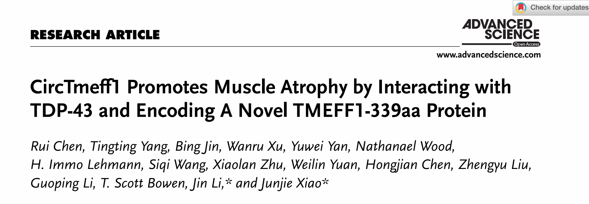 近日,Beat365唯一官方网站生命科学学院心血管研究所青年教师李进副教授在肌肉萎缩研究中取得进展,揭示了一个多种不同类型所致肌肉萎缩发生的共同新靶点:环状RNA circTmeff1。相关成果以“CircTmeff1 Promotes Muscle Atrophy by Interacting with TDP-43 and Encoding A Novel TMEFF1-339aa Protein”为题发表在Advanced Science杂志(https://onlinelibrary.wiley.com/doi/10.1002/advs.202206732)。李进副教授和肖俊杰教授为共同通讯作者,博士生陈瑞(已毕业)、杨婷婷(目前为Beat365唯一官方网站博士后)和硕士生金冰为共同第一作者,Beat365唯一官方网站为第一完成单位。