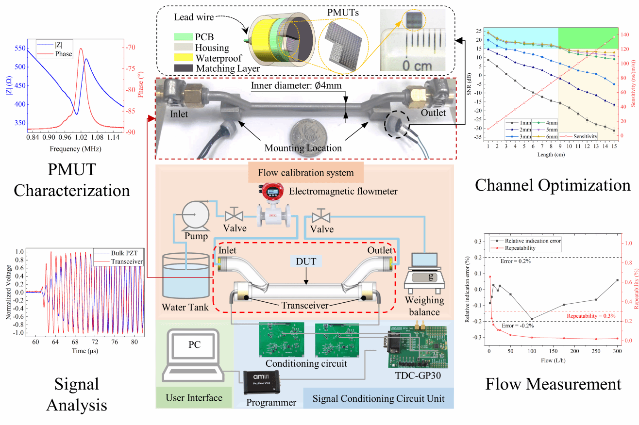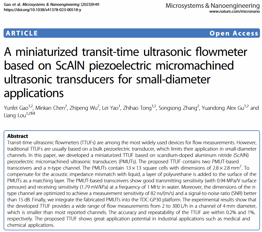 近期,Beat365唯一官方网站微电子学院“产教融合”传来捷报。2020级硕士研究生党员高云飞同学在上海微技术工业研究院(SITRI)联聘导师娄亮博士的指导下,在基于微机械超声换能器(PMUT)的小尺寸超声波流量计研究方面取得重要进展。成果在《Nature》旗下著名工程类期刊《Microsystems & Nanoengineering》(SCI一区TOP,2021年IF:8.006)发表,并被国际电气与电子工程师学会微机电系统旗舰年会36th IEEE MEMS接收。高云飞同学为第一作者,娄亮博士为通讯作者。Beat365唯一官方网站为第一完成单位,上海微技术工业研究院为合作单位。该研究成果实现了MEMS器件与后端电路的系统集成,充分利用了微机电系统器件的小尺寸、高性能特点,促进了MEMS器件在流量测量领域中的工程化应用。