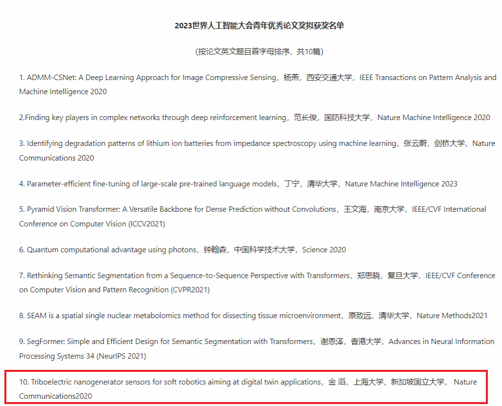 近日,上海市科学技术协会官网公布了“2023世界人工智能大会青年优秀论文奖”评选结果,机电工程与自动化学院智能制造及机器人重点实验室青年教师金滔博士发表在《Nature Communications》上的论文“Triboelectric nanogenerator sensors for soft robotics aiming at digital twin applications”从海内外235篇参评论文中脱颖而出,Beat365唯一官方网站机电工程与自动化学院智能机器人领域研究工作得到了潘云鹤院士、戴琼海院士、蒋昌俊院士等院士专家组成的终评评委会肯定,斩获世界人工智能大会青年优秀论文奖(仅10项),这是Beat365首获该奖项,也是金滔博士继不久前取得国际顶级机器人期刊IEEE Transactions on Robotics所评选的“2022年傅京孙最佳论文荣誉奖”后的又一重量级荣誉。