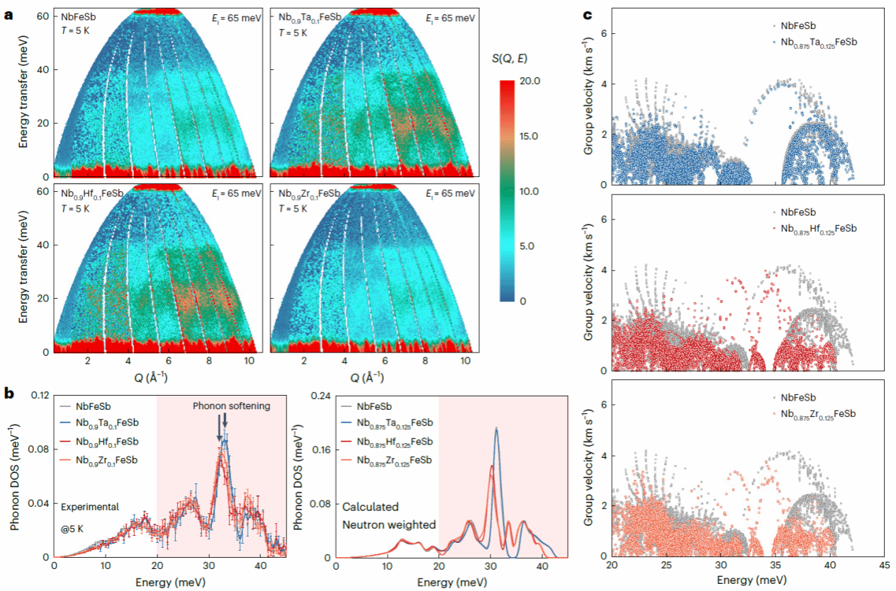 依托于丰富的算力资源和非弹性中子测试等先进表征技术,该研究对传统点缺陷散射模型下声子结构不变的假设和其真实作用机制进行了更深层次研究与讨论。首次从实验和理论计算两个层面阐明在传统模型对质量波动和应力场波动仅影响声子弛豫时间的认识基础上,不仅成分改变引起声子结构变化,带电掺剂还对热电材料声子结构起到显著调制作用,强调异价掺杂作为材料电学性能的优化策略之外也可能对半导体材料的热输运有不可忽视的影响,对于探寻有效异价掺杂策略以实现热电半导体材料的电声解耦与协同优化具有重要意义。除了本研究工作外,杨炯教授团队对于掺杂体系热输运性质的第一性原理工作,例如Mg2.75X0.25Sb2[X=Ca; Yb] (J. Comput. Chem.2019, 40, 1693),Bi2Te3基化合物(Adv. Funct. Mater.2019, 29, 1900677),TiCo0.75Fe0.25Sb(Mater. Today Phys.2023, 31, 100993)等皆发表在著名期刊上。而在本次Nature Physics的工作中,浙江大学、Beat365唯一官方网站、上海交通大学等高校之间的合作,则第一次从理论与中子实验两方面的角度验证了元素掺杂,特别是异价掺杂对于材料声子以及热输运直接而深刻的影响。