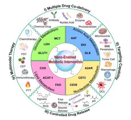 癌症免疫疗法是一种通过激活宿主免疫反应来抑制肿瘤生长和转移的肿瘤治疗新范式,近年来已取得突破性进展。然而,在实际临床应用过程中仍面临患者响应率低,毒副作用大等挑战。研究发现,过度增殖的肿瘤细胞会加剧肿瘤营养物质和氧气的消耗,导致产生以酸性、缺氧、营养匮乏和免疫抑制性代谢产物堆积为主要特征的肿瘤代谢微环境的变化。这些异常的肿瘤代谢微环境限制了肿瘤浸润免疫细胞的功能,促进了肿瘤免疫逃逸,影响临床免疫治疗的预后。因此,靶向调控肿瘤代谢有望“重振”抗肿瘤免疫反应,增强肿瘤免疫治疗作用。为克服肿瘤代谢微环境对抗肿瘤免疫反应产生的抑制作用,近年来研究人员开发了一系列可“改写”肿瘤代谢的纳米药物,已发展成为肿瘤免疫治疗的新策略。