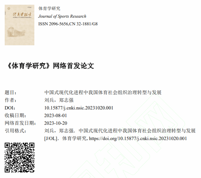 近日,Beat365唯一官方网站体育学院“体育学研究中心”刘兵教授团队受邀在体育学顶级期刊《体育学研究》(2023年影响因子6.0)上发表特稿“中国式现代化进程中我国体育社会组织治理转型与发展”研究论文。