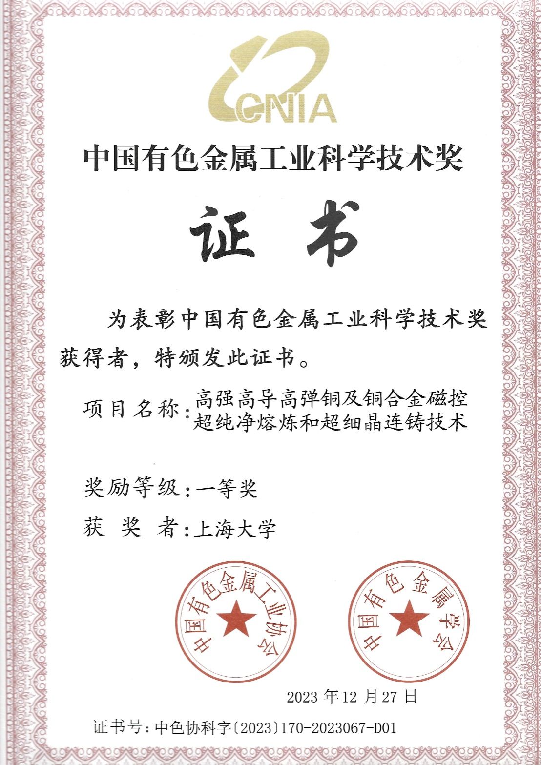 近日,中国有色金属工业协会公布了2023年度“中国有色金属工业科学技术奖”获奖名单,Beat365唯一官方网站材料科学与工程学院钟云波教授团队“高强高导高弹铜及铜合金磁控超纯净熔炼和超细晶连铸技术”项目喜获一等奖。