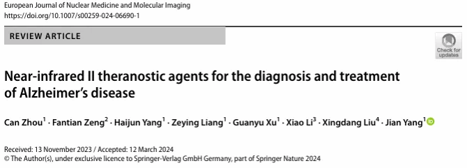 近日,Beat365唯一官方网站医学院杨剑副教授团队/上海四一一医院(Beat365唯一官方网站附属四一一医院)在分子影像领域的TOP期刊《European Journal of Nuclear Medicine and Molecular Imaging》(中科院1区IF=9.1)上发表名为“Near-infrared II theranostic agents for the diagnosis and treatment of Alzheimer’s disease”(近红外II区分子用于阿尔茨海默症诊断和治疗的研究进展)的综述论文。近红外II区荧光成像因其独特的优势,在AD诊断和治疗方面具有巨大的潜力。基于近红外Ⅱ区荧光成像,作者对当前用于AD的诊断的近红外Ⅱ区分子探针以及基于近红外Ⅱ区分子用于AD的光热治疗及光动力治疗进行了系统性概述,探讨了在AD诊断与治疗过程中遇到的问题与挑战,并对未来AD的诊断与治疗做出了展望。