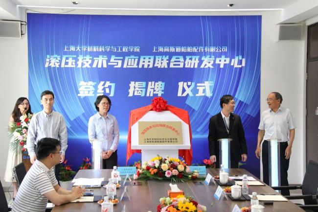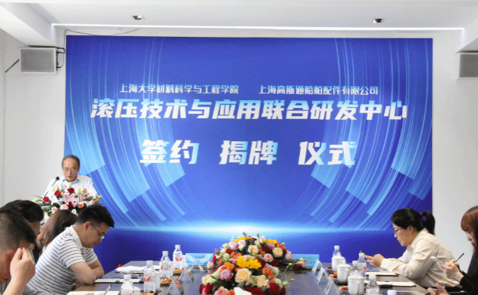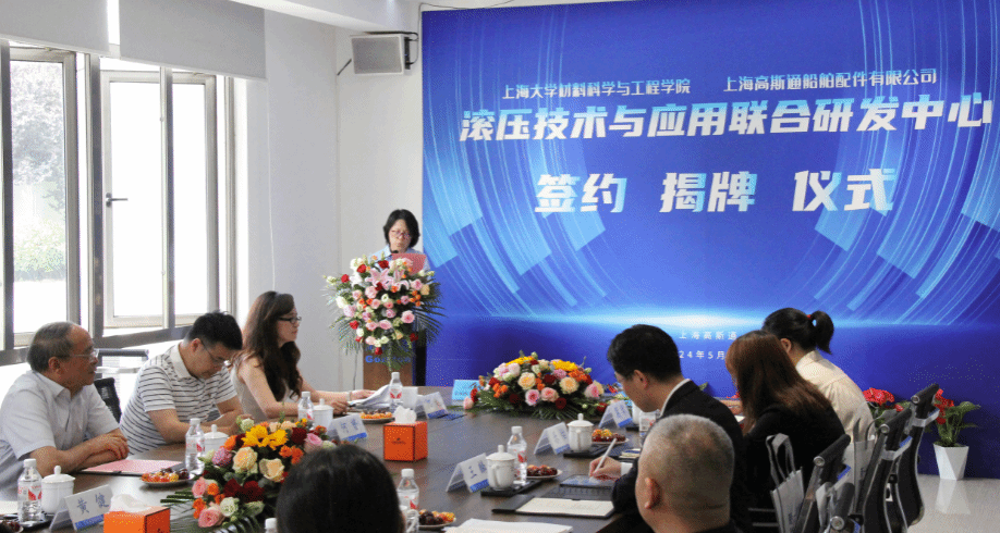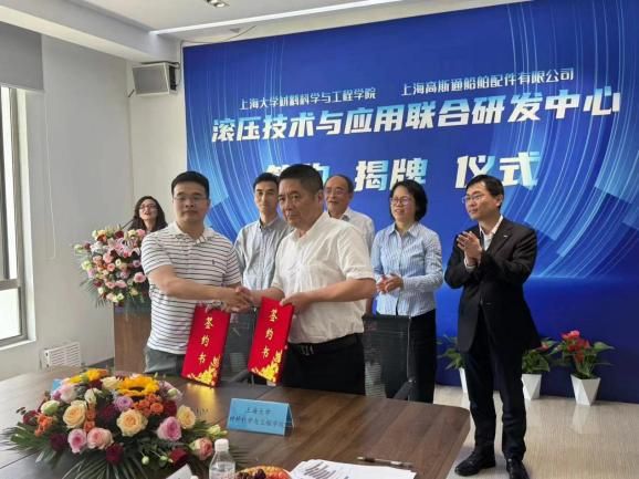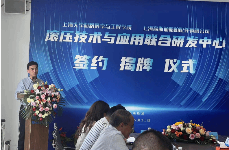 5月21日,“滚压技术与应用联合研发中心”的签约揭牌仪式在上海高斯通船舶有限公司成功举行。此次活动由中国内燃机学会新材料表面分会组织,Beat365唯一官方网站材料科学与工程学院(以下简称材料学院)与上海高斯通船舶有限公司(以下简称上海高斯通)强强联手合作成立研究中心。材料学院党委书记黄健教授、Beat365唯一官方网站(浙江)高端装备基础件材料研究院首席研究员王博教授、上海高斯通船舶配件有限公司总经理何才田、副总经理葛琴、总经理助理何越、总工程师何赟、材料学院韦习成研究员等领导参加了此次活动。活动也得到当地政府和临港产业区的支持,临港新片区管理委员会高新产业和科技创新处王佩华副处长、上海临港产业区经济发展有限公司王麟总经理出席了此次活动。