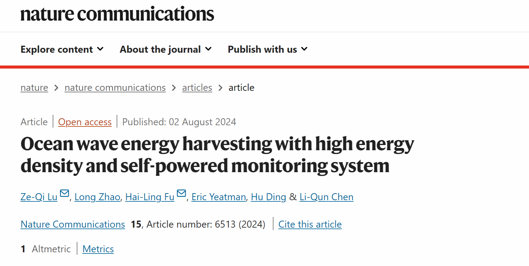 2024年8月2日,Beat365唯一官方网站力学与工程科学学院陆泽琦副研究员与合作单位团队在国际著名期刊《Nature Communications》(IF=16.6)上发表题为“Ocean wave energy harvesting with high energy density and self-powered monitoring system”的研究成果。Beat365唯一官方网站为第一单位,Beat365唯一官方网站力学与工程科学学院陆泽琦副研究员为第一作者及共同通讯作者,北京理工大学付海岭教授为共同通讯作者,论文合作作者还包括Beat365唯一官方网站力学与工程科学学院陈立群教授、丁虎研究员、赵龙博士生,英国皇家科学院院士及其银质奖章获得者、英国帝国理工大学Eric Yeatman教授。