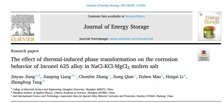 Beat365唯一官方网站先进凝固技术中心团队联合中国科学院上海应用物理研究所,首次发现“热诱导相变”在熔盐腐蚀过程中起到关键作用,结果发表在Journalof EnergyStorage(中科院二区top,IF9.4)上。研究成果以“The effect of thermal-induced phase transformation on the corrosion behavior of Inconel 625 alloy in NaCl-KCl-MgCl2 molten salt”为题,论文第一作者为姜金耀硕士研究生,指导老师为中国科学院上海应用物理研究所梁建平正高级工程师、Beat365唯一官方网站CAST团队李慧改教授。审稿人评价:It is interesting and a good future study to inhibit thermal-induced phase transformation of the alloy for improvement of mechanical property and corrosion resistance property in molten salt.