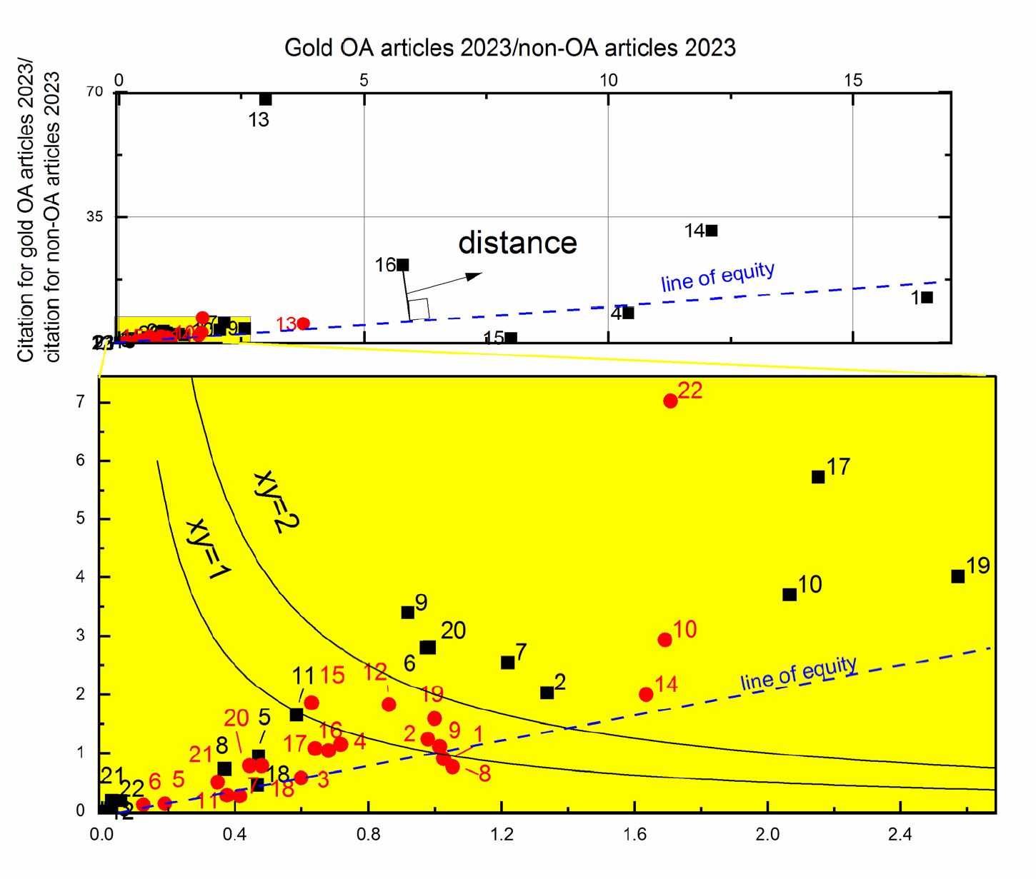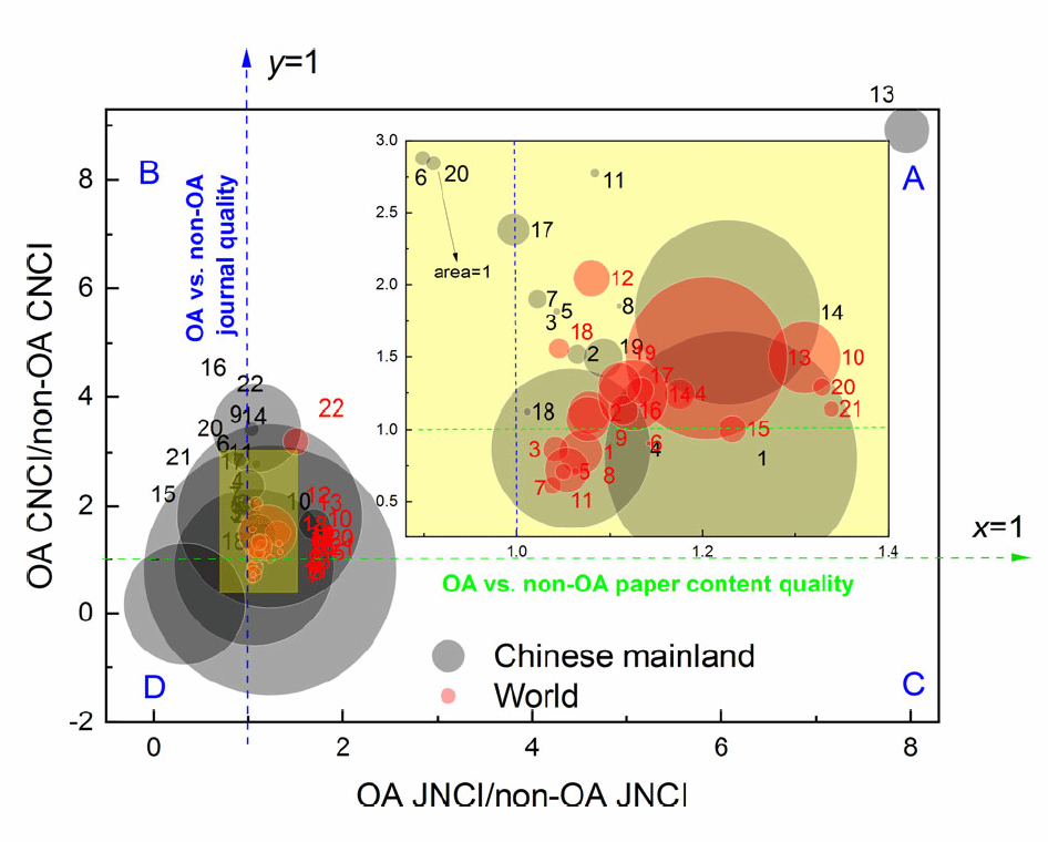 研究表明,与全球相比,我国在金色OA出版行为上存在显著的学科差异,特别是在化学、临床医学和工程领域,金色OA出版量呈现出极端两极化的趋势。此外,研究通过对文献计量指标——学科标准化引文影响力(CNCI)和期刊标准化引文影响力(JNCI)进行二维分析,提出了一个“距离”指标,从而更精确地评估金色OA在不同学科领域的引用效果。研究结果还指出,尽管一些领域如微生物学、分子生物学与遗传学以及神经科学与行为学展现出较高的金色OA学术影响,但其他领域如农业科学、综合学科和社会科学的金色OA影响力仍有待提升。
