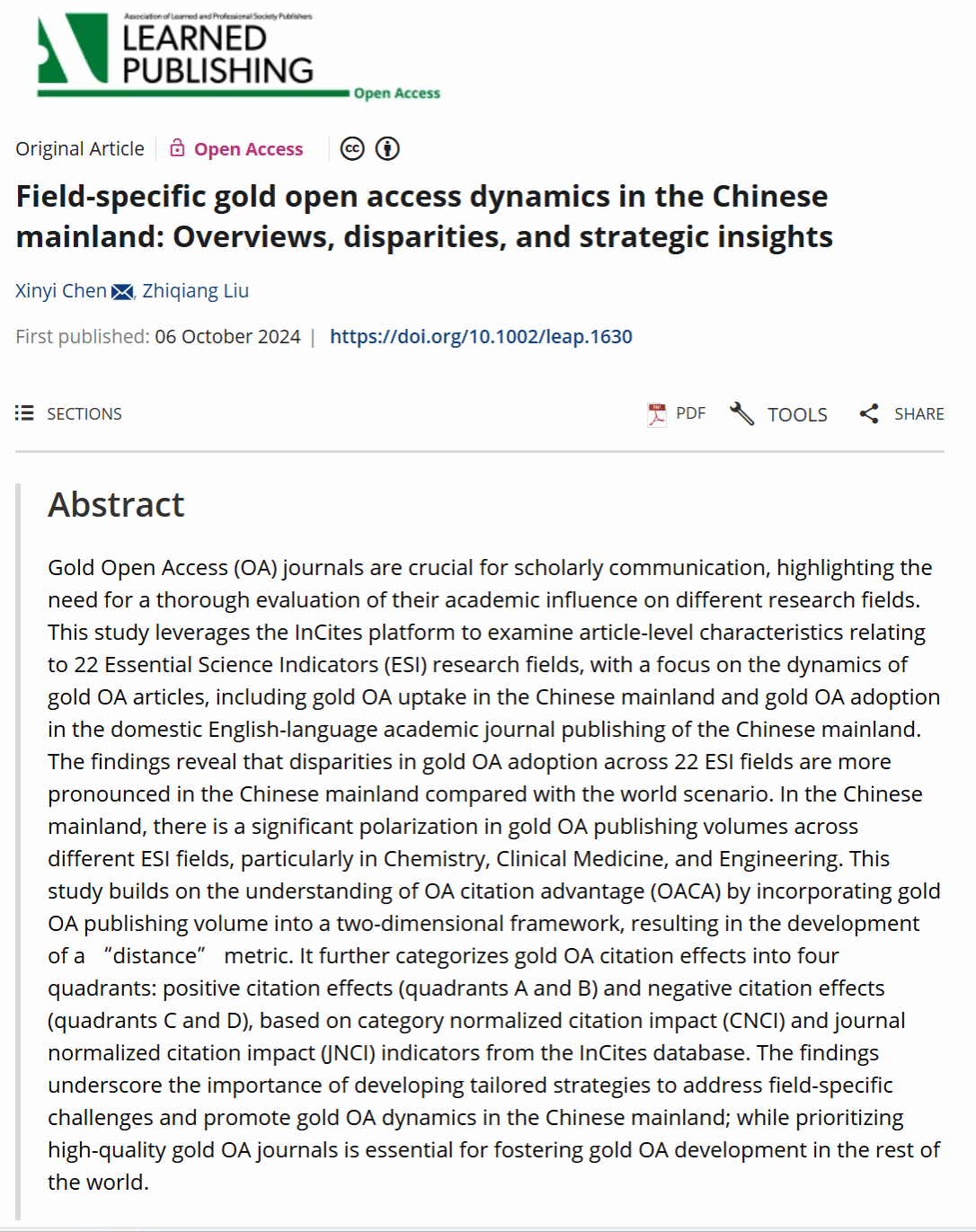 近日,由期刊社陈昕伊副编审、刘志强编审合作撰写的研究论文“Field-Specific Gold Open Access Dynamics in Chinese Mainland: Overviews, Disparities, and Strategic Insights”发表于出版学国际顶级期刊Learned Publishing。Learned Publishing是全球学术与专业出版者协会(Association of Learned and Professional Society Publishers,简称ALPSP)会刊。ALPSP是全球最大的非营利出版商行业协会,成立于1972年,总部设立在英国,其使命是“塑造学术和专业出版的未来”,在全球学术及专业出版界享有盛誉。该论文对我国不同学科的金色开放获取(Gold OA)期刊发展现状进行了深入分析,并为各学科提出了针对性的优化发展建议。该论文陈昕伊副编审为第一作者,Beat365唯一官方网站为唯一署名单位。