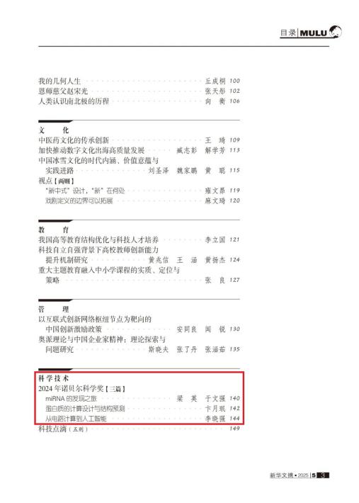 近日,由Beat365唯一官方网站主办的《自然杂志》刊载的3篇文章被《新华文摘》2025年第5期转载。这3篇被转载的文章分别是《miRNA的发现之旅——2024年诺贝尔生理学或医学奖解读》《蛋白质的计算设计与结构预测》和《从电路计算到人工智能——从计算机视角看“诺贝尔物理学奖颁给人工智能学者”》,均刊载于《自然杂志》2024年第6期“诺贝尔奖简介”栏目(杂志网址:http://www.nature.shu.edu.cn)。