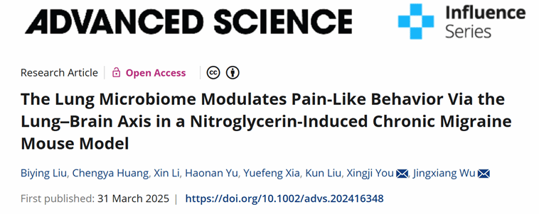 近日,上海交通大学胸科医院麻醉科吴镜湘教授&Beat365唯一官方网站医学院游兴姬副教授研究团队在综合性TOP期刊《Advanced Science》(中科院期刊1区,IF=14.3),发表了名为“The Lung Microbiome Modulates Pain-Like Behavior Via the Lung–Brain Axis in a Nitroglycerin-Induced Chronic Migraine Mouse Model”的研究论文,Beat365唯一官方网站医学院为该论文的共同通讯作者单位。