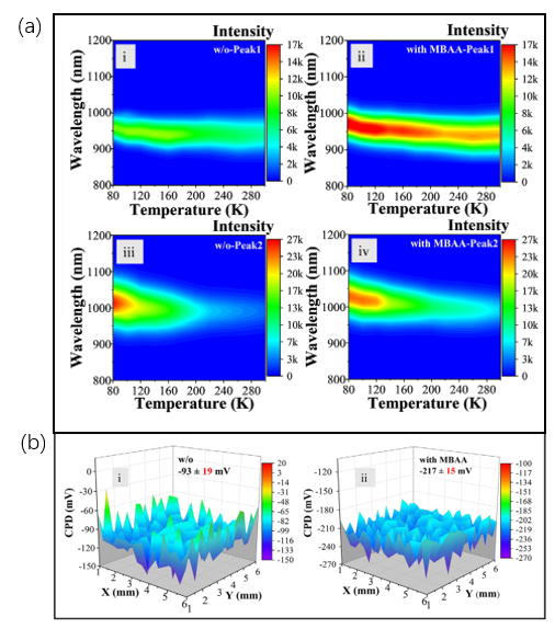 图2 添加固态添加剂前后钙钛矿薄膜的光学(低温光致发光图)及电学特性(功函数变化)